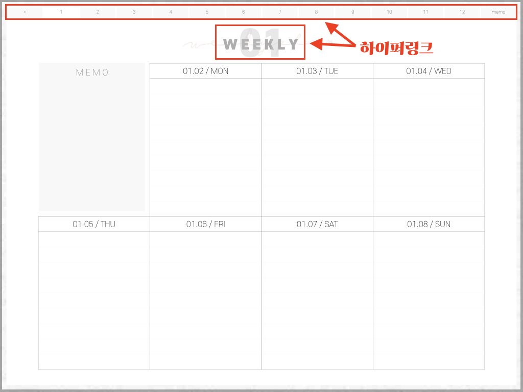 ▼ 위클리 페이지는 상단에 다른 먼슬리로 이동할 수 있는 하이퍼링크와 해당하는 월로 이동할 수 있는 하이퍼링크가 있습니다. (두 개의 달이 함께 있는 경우에는 날짜가 많이 있는 달로 이동하게 됩니다.)