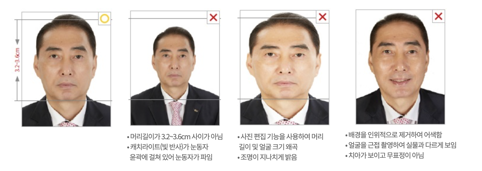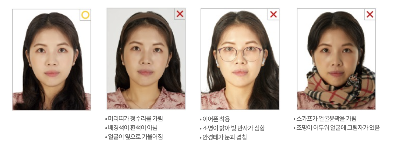※ 실제 우리 국민이 여권사진 문제(앞머리가 눈썹을 과도하게 가린 사진)로 유럽지역 공항에서 출입국시 불편을 겪은 사례가 있습니다.