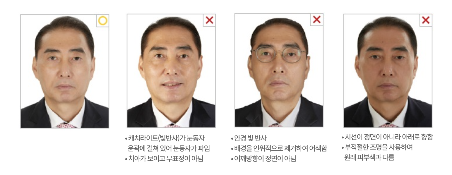 ※ 실제 우리 국민이 여권사진 문제(앞머리가 눈썹을 과도하게 가린 사진)로 유럽지역 공항에서 출입국시 불편을 겪은 사례가 있습니다.