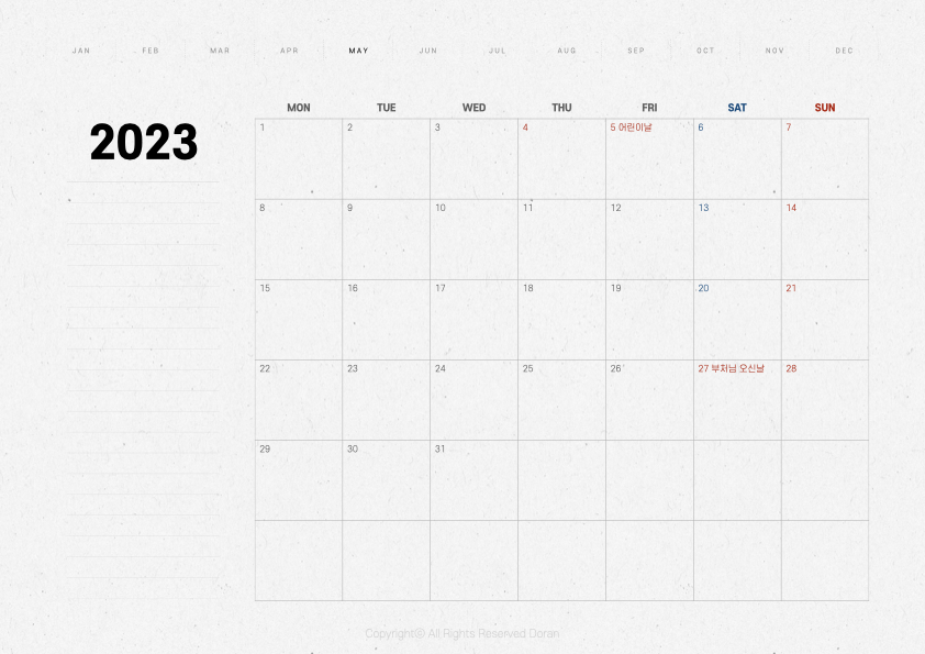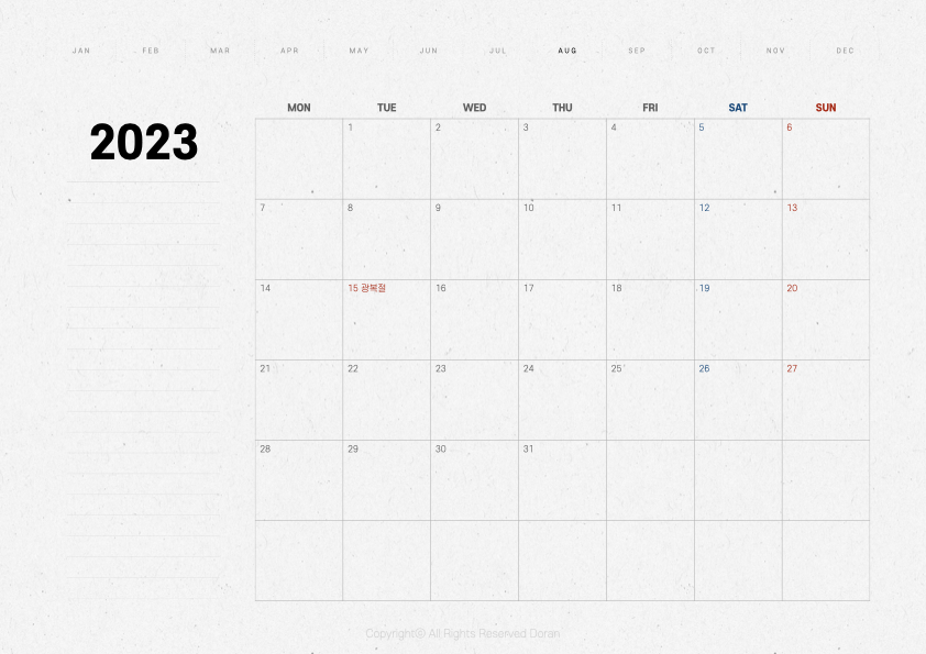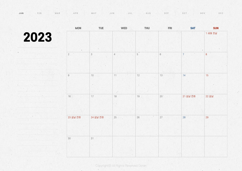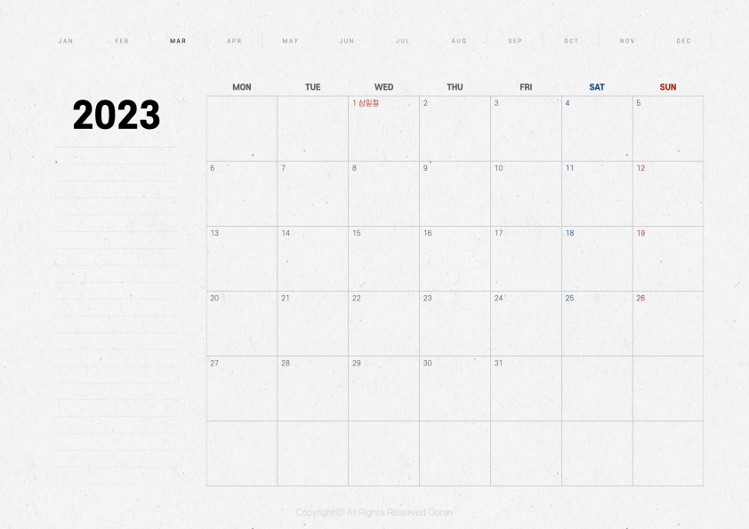 2023 다이어리 속지들을 열심히 만들어서 공유하고 있는 도란입니다 :) ㅎㅎㅎ 이제 거의 막바지에 다다르고 있는 것 같네요. 개인적으로 속지 만드는 초창기에 제가 자주 사용했던 심플 먼슬리 속지입니다! 이 속지는 글씨만 몇 자 적어놔도 깔끔하고 예쁘더라고요. 종이 질감 느낌의 배경을 넣어서 더욱 종이에 쓰는 느낌이 드는 속지입니다.