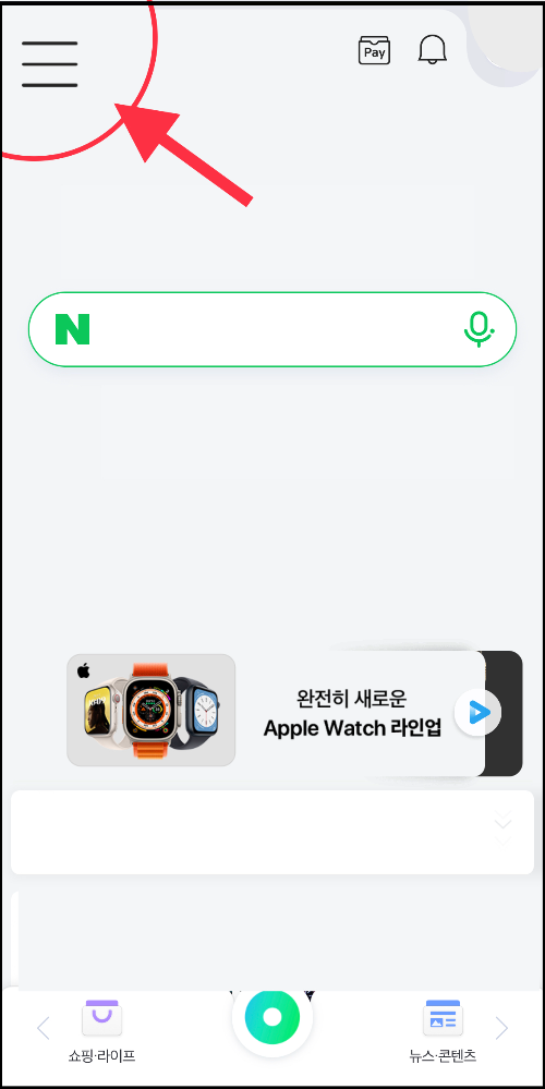 ▼ 핸드폰에서 네이버 어플을 실행한 뒤 왼쪽 사단에 있는 [선 세개] 메뉴를 선택합니다.