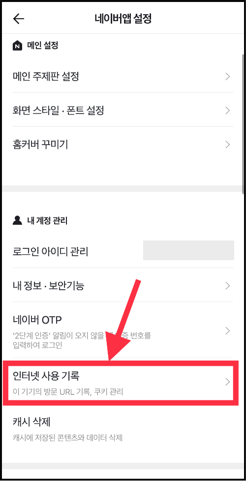 ▼ 네이버 앱 설정 아래쪽에 있는 [인터넷 사용 기록] 메뉴를 누릅니다.