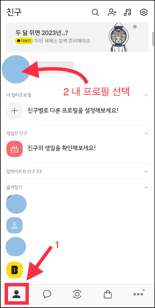 ▼ 카카오톡을 열고 카톡 하단 왼쪽에 있는 [친구]를 누르면 내 프로필이 가장 위에 나옵니다. [내 프로필 사진]을 눌러주세요.