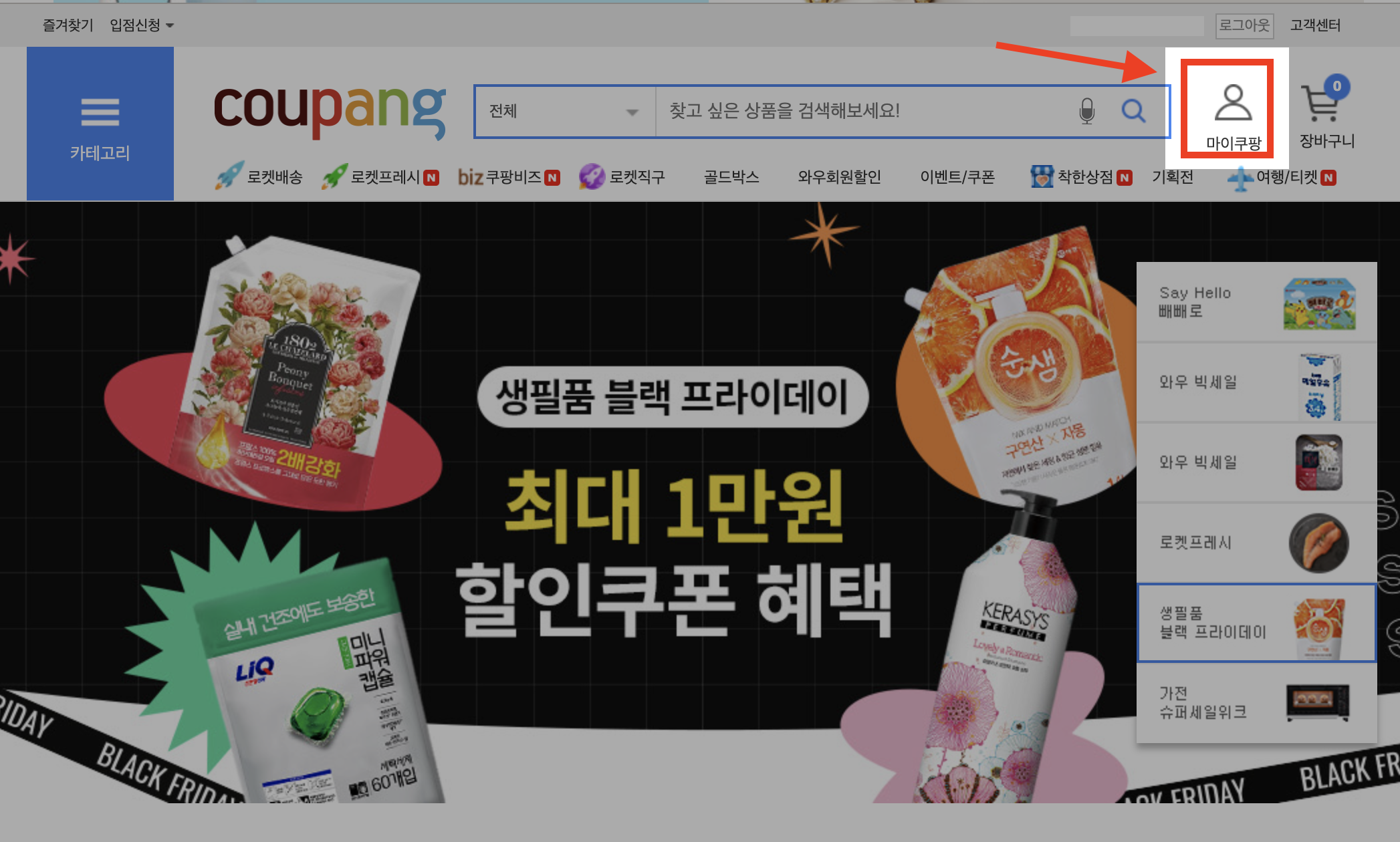 ▼ PC에서 쿠팡 홈페이지에 접속합니다. 그리고 로그인 후 오른쪽 상단에 있는 [마이쿠팡] 메뉴를 선택합니다.