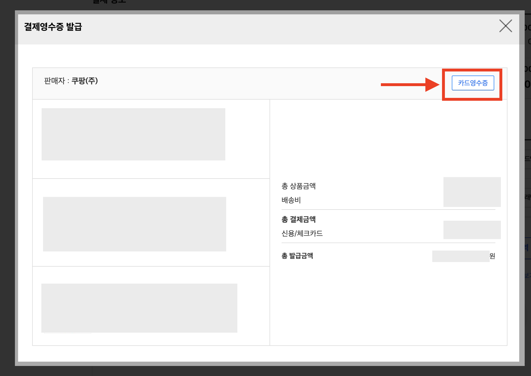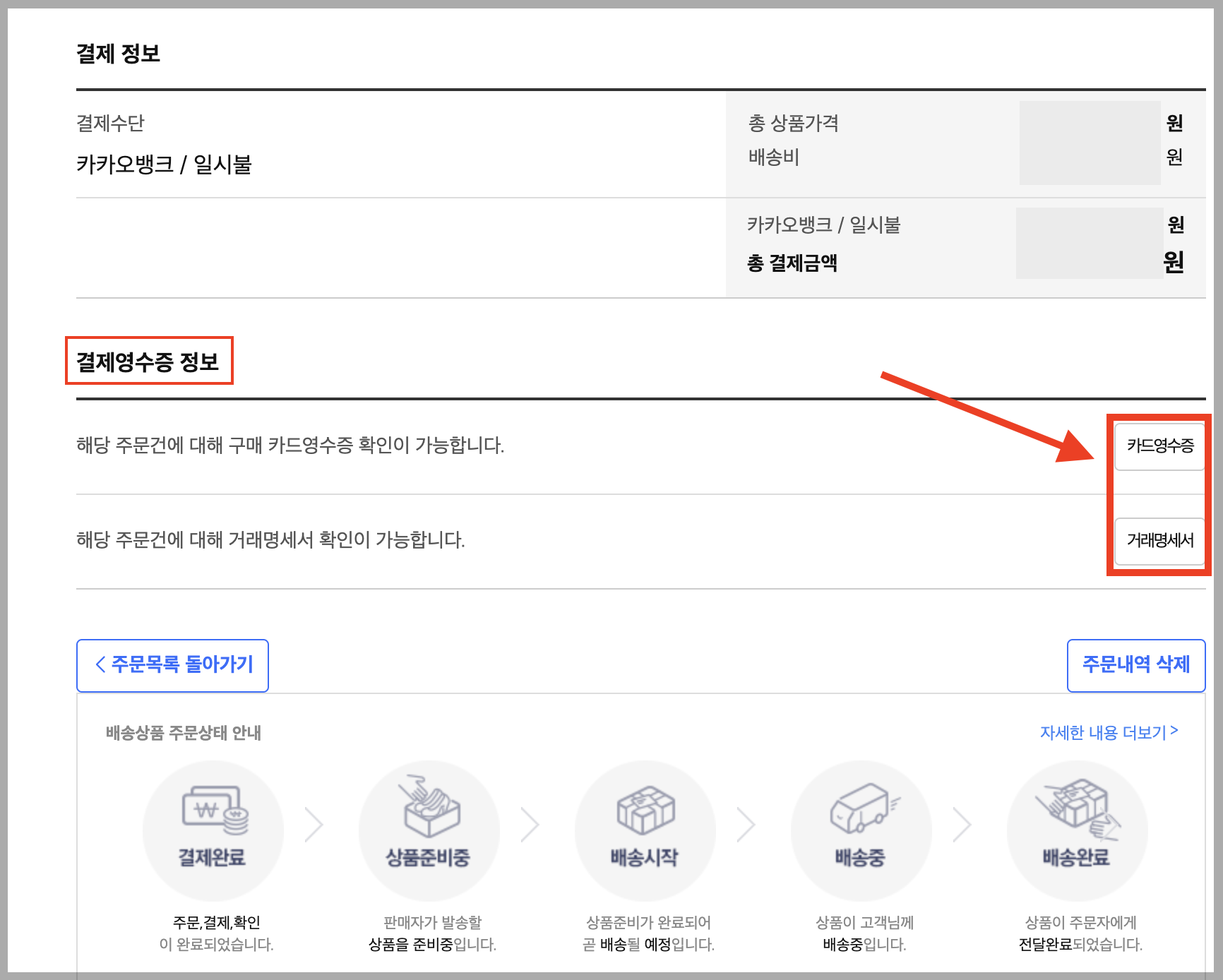 ▼ 스크롤을 아래로 주욱 내리면 [결제 영수증 정보]가 있는데, 오른쪽에 [카드영수증] 과 [거래명세서] 메뉴가 나옵니다.