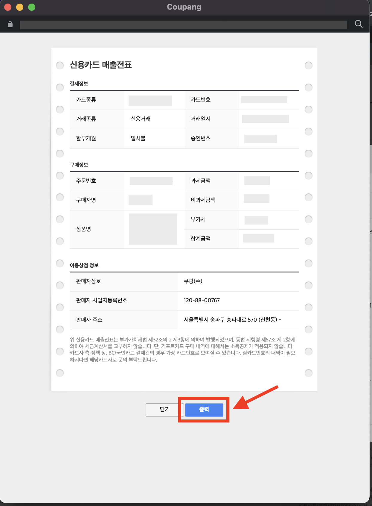 ▼ 실제 신용카드 매출전표와 같은 화면이 나옵니다. 아래에 [출력] 버튼을 눌러서 사용하면 됩니다.