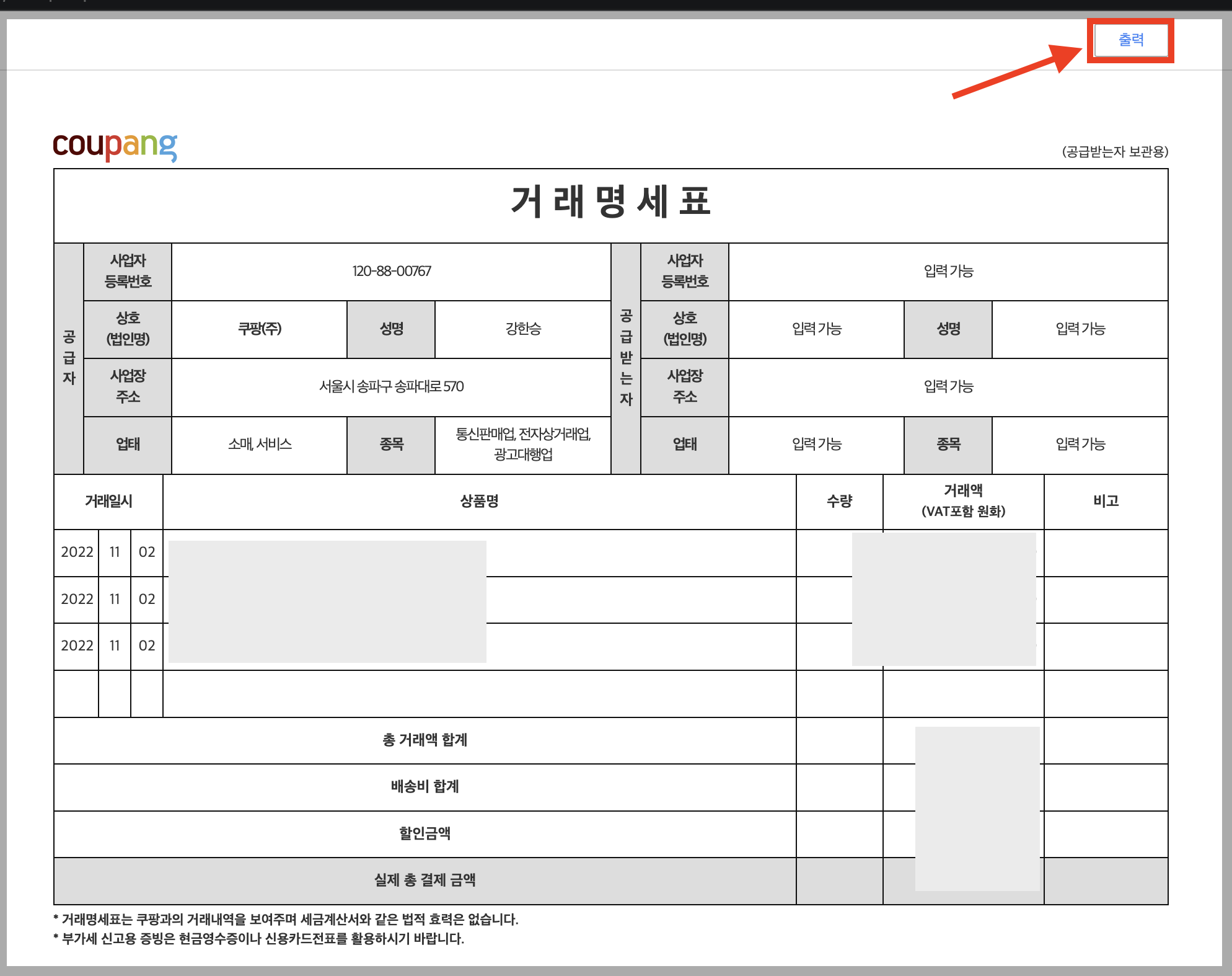 이렇게 쿠팡에서 주문한 상품들의 카드 영수증과 거래명세서를 출력할 수 있습니다.