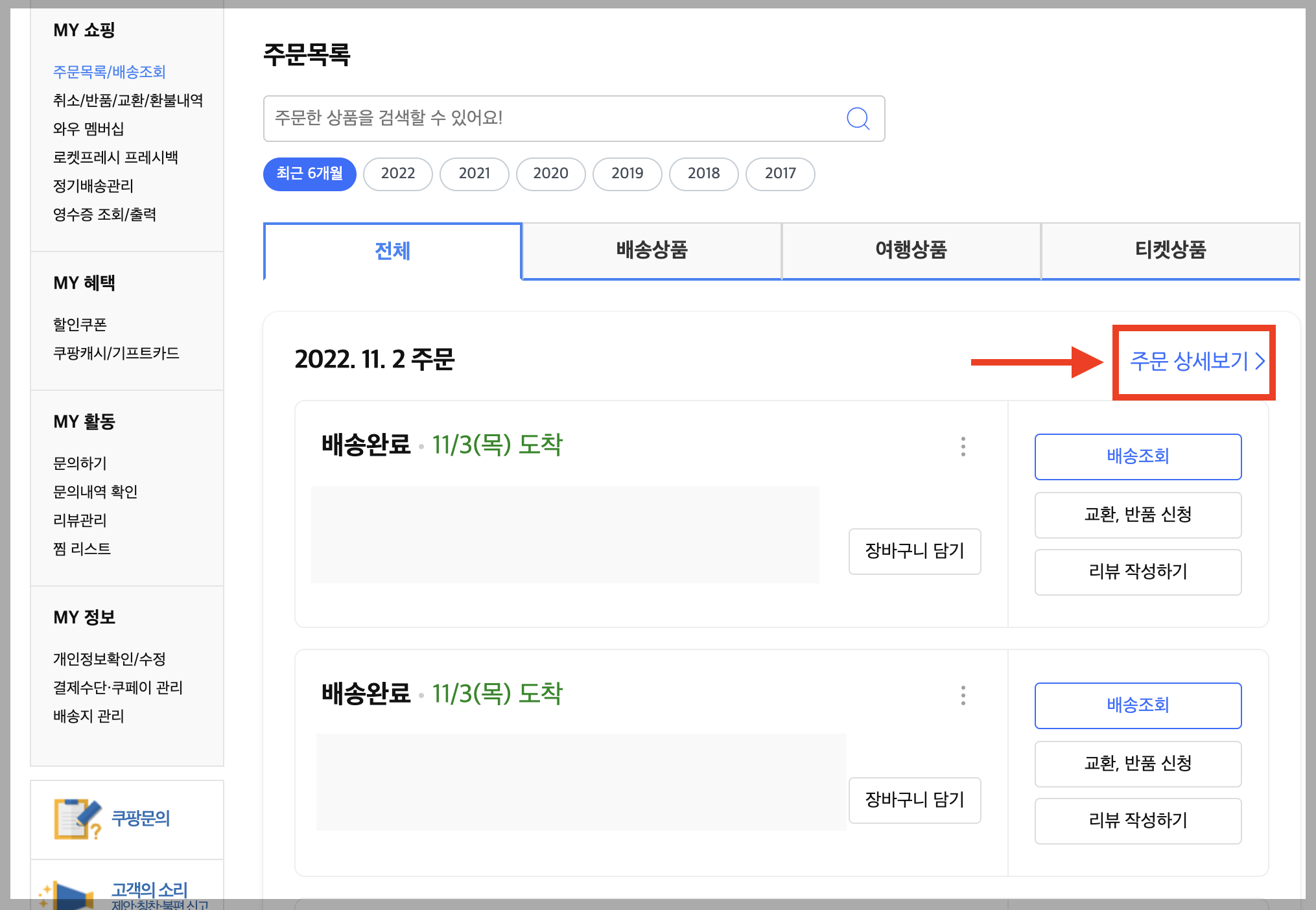 ▼ 쿠팡에서 주문했던 목록들이 나오는데, 거래명세서가 필요한 주문서 목록의 오른쪽 상단에 있는 [주문 상세보기 > ]를 누릅니다.