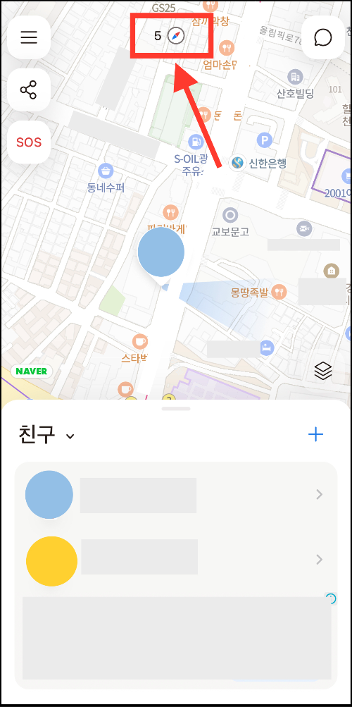 ▼ 위에 나침반과 숫자 5가 나와있는데. 이건 하루 동안 사용할 수 있는 위치추적의 횟수이다. 하루에 다섯 번 추적할 수 있는데 추가로 사용하고 싶으면 광고를 시청하면 된다. 하루에 한 번 혹은 두 번만 사용하기 때문에 부족하다고 느끼지는 않음 그리고 한번 추적하면 2분 동안 실시간으로 위치를 확인할 수 있다.