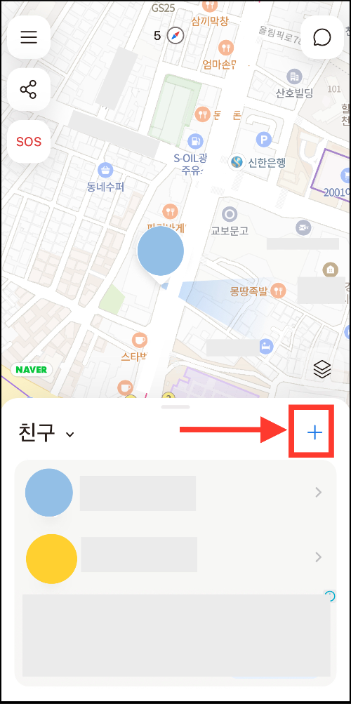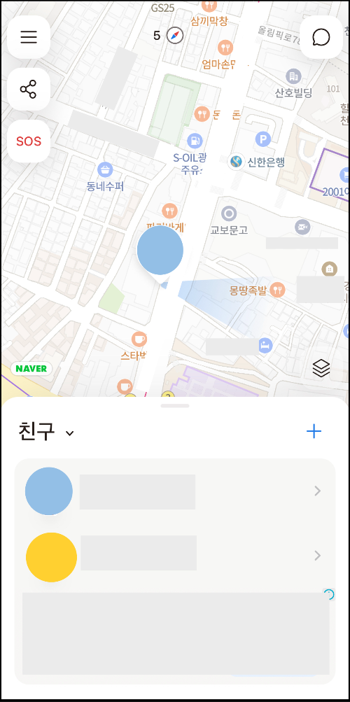 ▼ 어플을 실행하면 바로 나의 위치가 나온다. 그리고 아래에는 추가한 친구의 목록도 함께 나온다.
