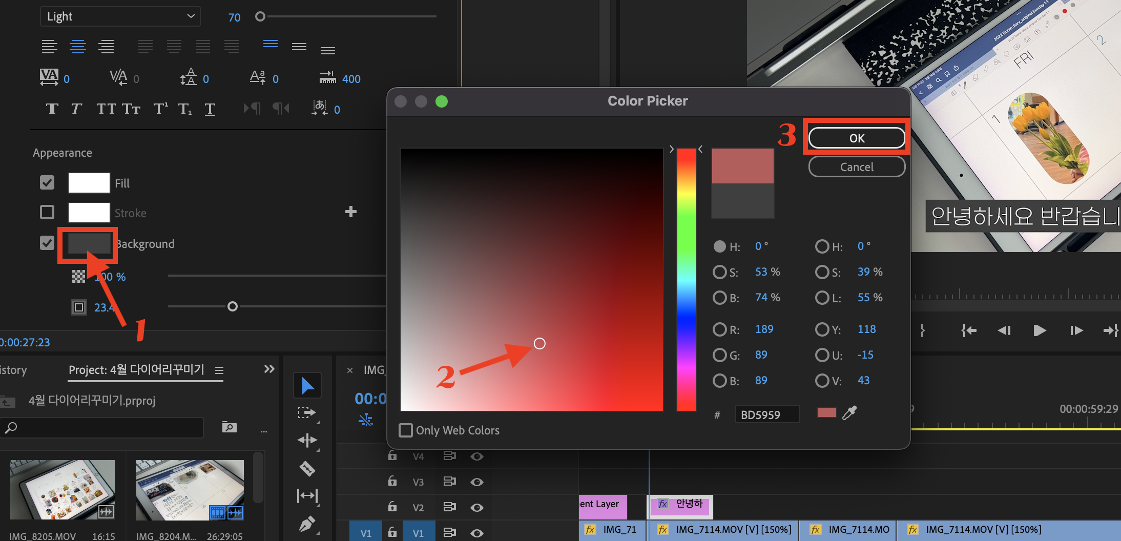 ▼ 자막바의 색상은 Background 옆에 있는 [색상을 클릭] 하면 됩니다. 그리고 원하는 색상을 선택한 뒤, OK 버튼을 눌러줍니다.