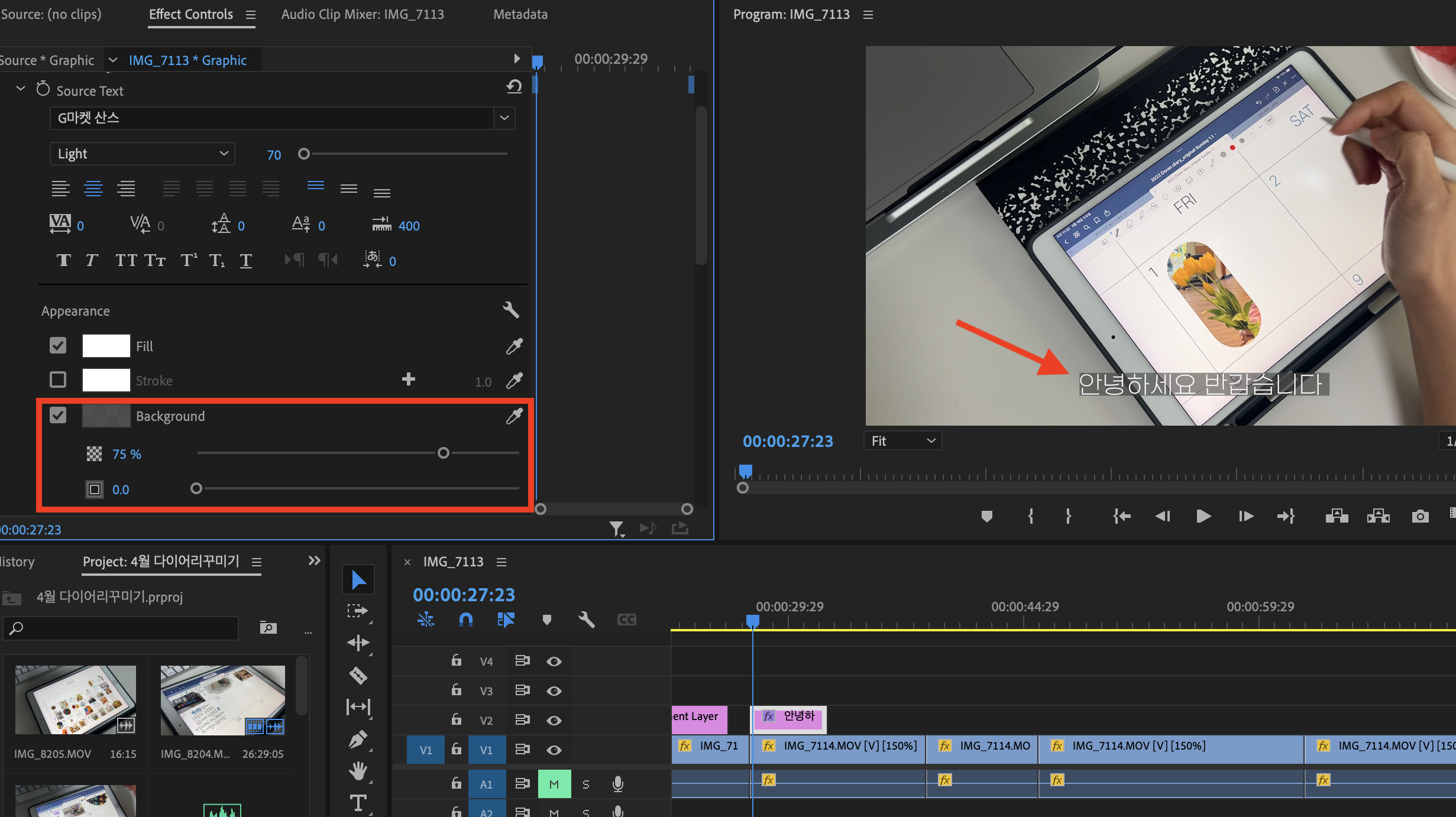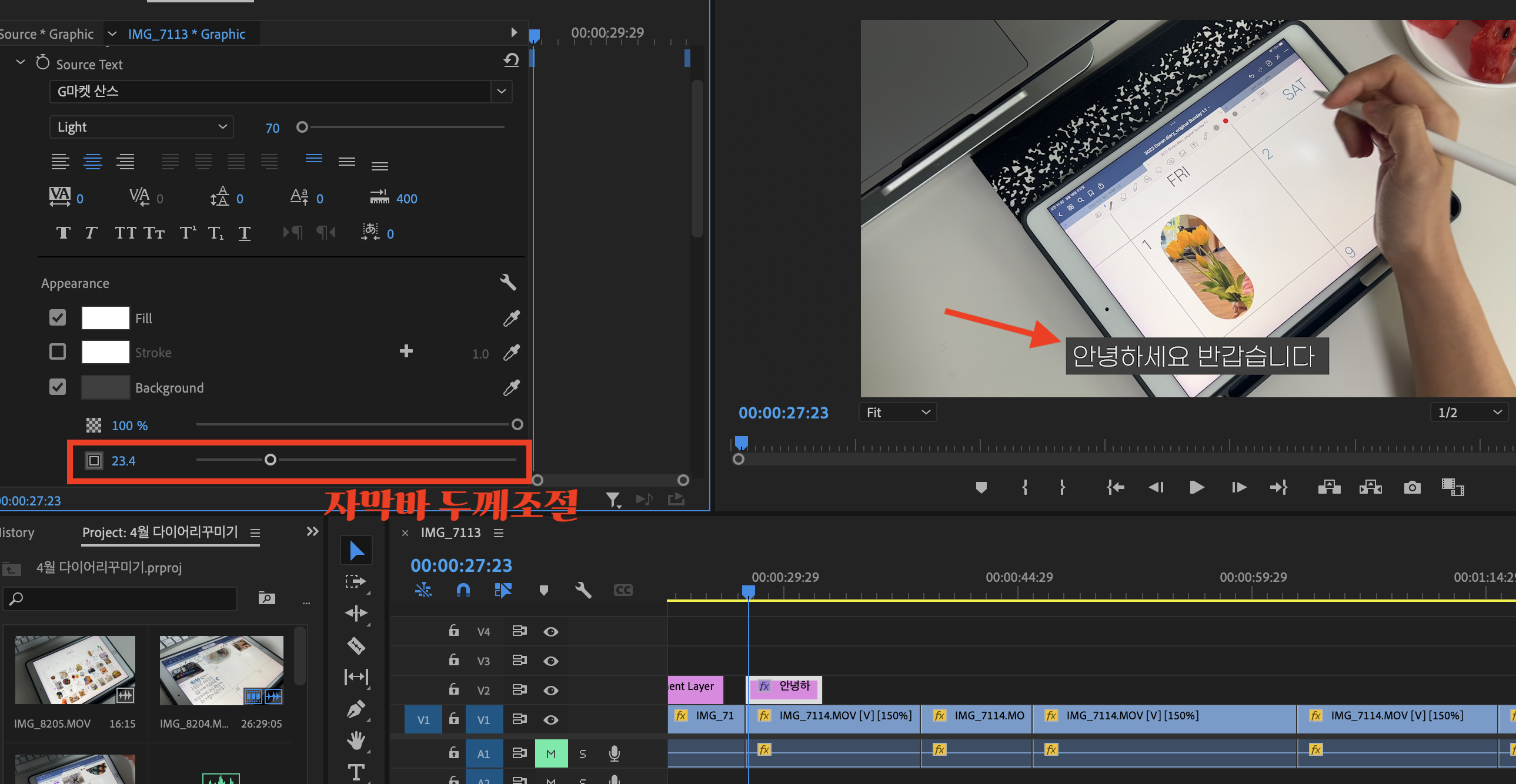 프리미어 프로에서 영상편집을 할 때, 자막 색깔이 뒤에 있는 화면 색상이랑 비슷해서 자막이 잘 보이지 않을 때가 있습니다. 이럴 때에는 자막 뒤에 네모 모양의 색깔 배경을 만들어 주어 자막을 잘 보이게 할 수 있는데요. 이 기능을 [자막바] 라고 합니다. 프리미어 프로에서 자막바를 간단하게 만드는 방법을 알아보겠습니다.