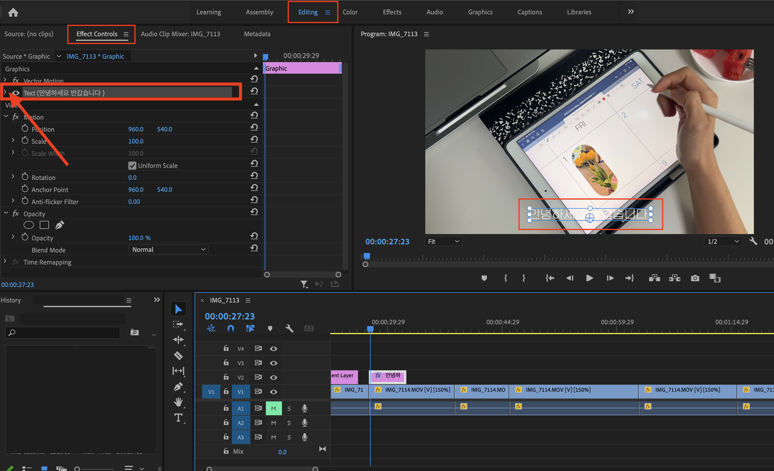 ▼ 먼저 자막바를 만들어 줄 자막을 화면에서 선택합니다. 그러면 왼쪽에 이펙트 컨트롤창이 나타나는데, 여기서 자막의 텍스트가 적힌 칸의 맨 왼쪽의 화살표를 눌러줍니다. (이펙트 컨트롤 창이 안 나올 때에는 상단에 Editing - Effect Controls을 누릅니다)