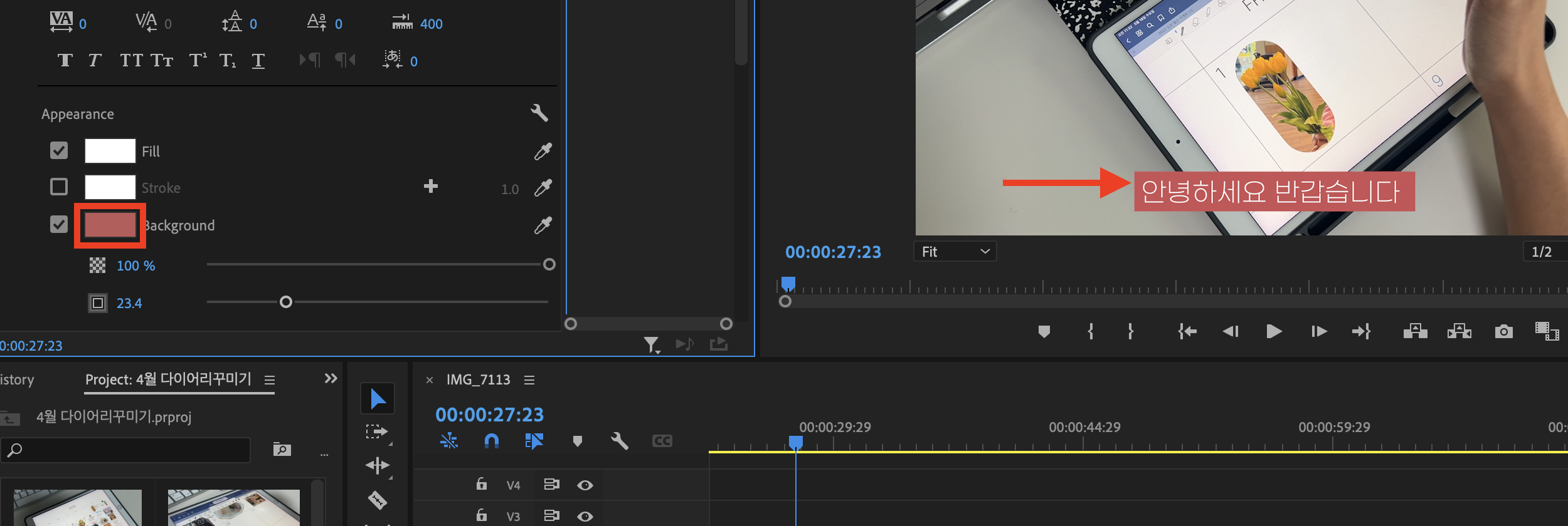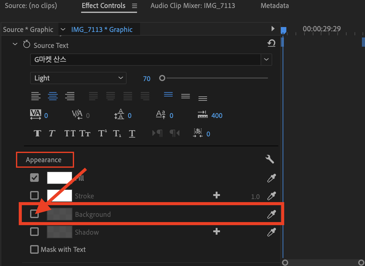 ▼ 자막 편집창 아래쪽에 보면 [Appearance]메뉴가 나오는데, 그중에서 [Background] 메뉴에 체크 선택을 해줍니다.