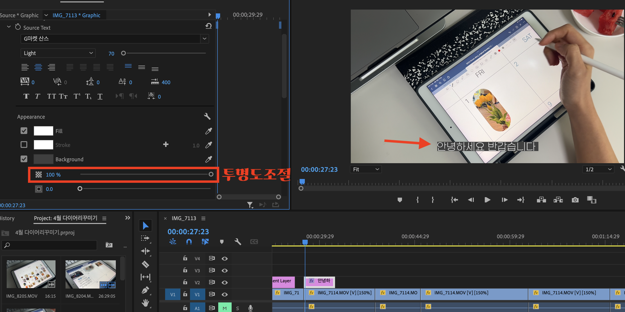 프리미어 프로에서 자막바 넣는 방법을 알아보았고, 투명도와 두께 조절 그리고 자막바의 색상까지 변경해보았습니다. :) 이상입니다.