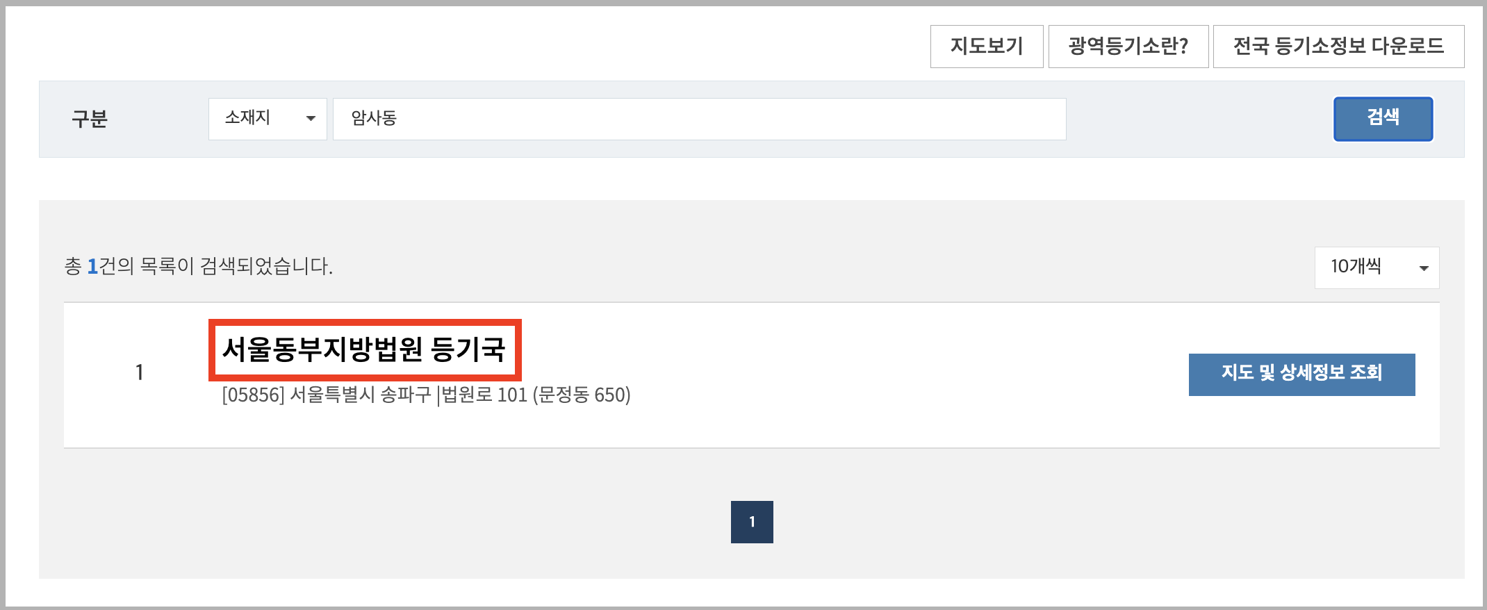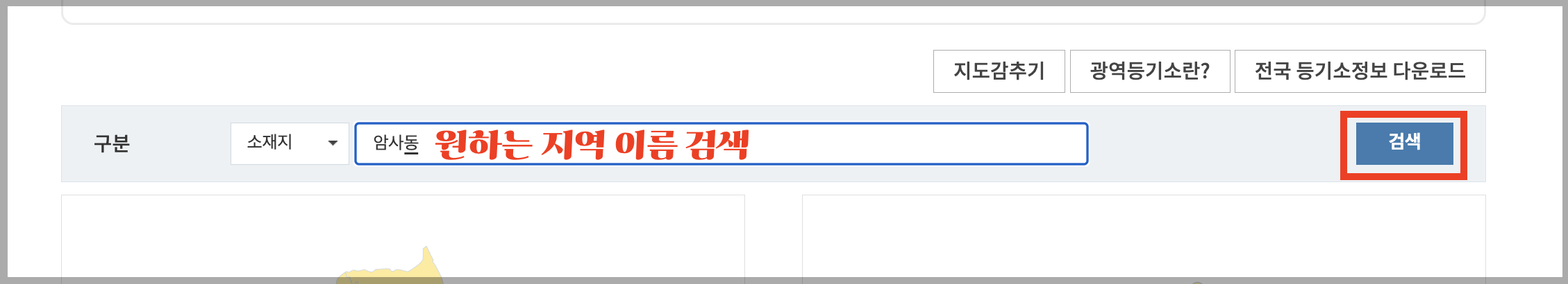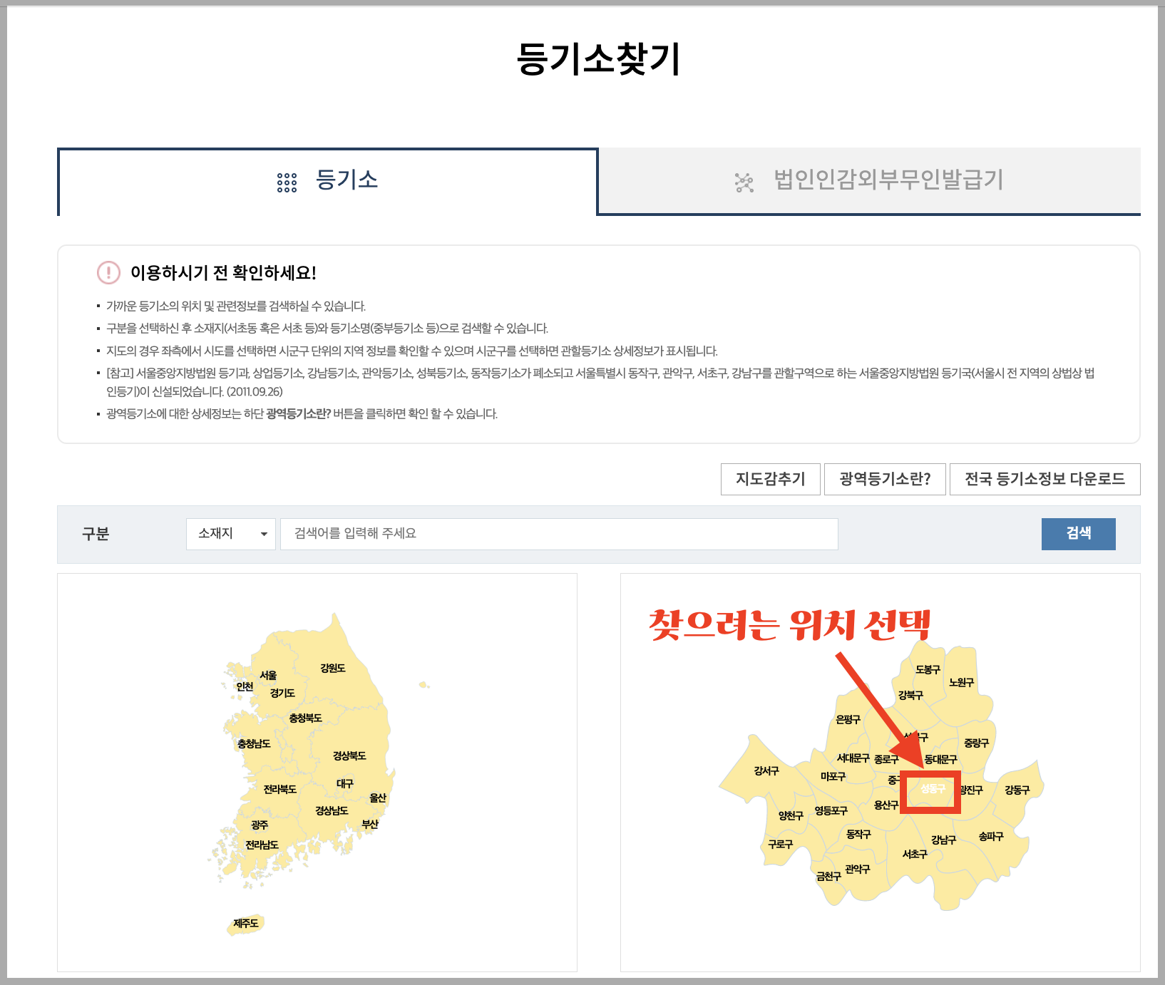 ▼ 등기소 위치를 찾을 수 있는 지도가 나옵니다. 여기서 본인이 가진 임대 매물의 위치를 선택합니다.