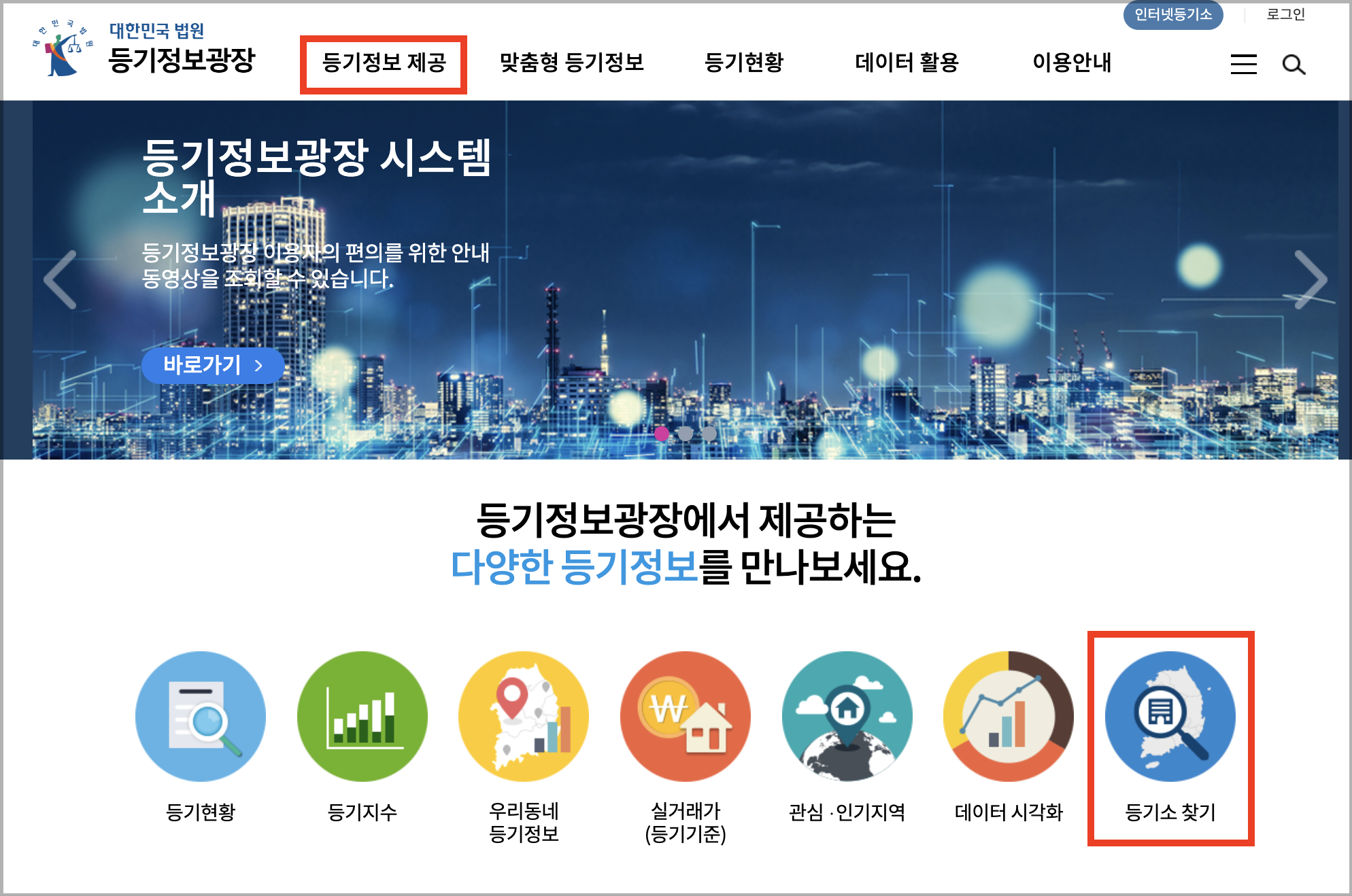 ▼ 먼저 대한민국 법원 <등기정보광장 홈페이지>에 접속합니다. 바로 메인화면에서 [등기소 찾기] 메뉴를 누릅니다.