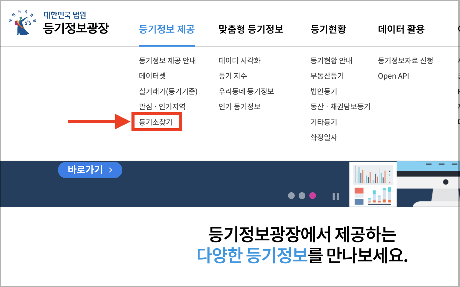 ▼ 혹은 상단메뉴에서 [등기정보 제공] - [등기소 찾기] 메뉴로 들어갑니다.