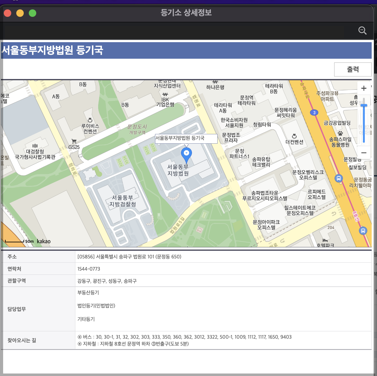 ▼ 아래와 같이 등기소 상세 정보가 나옵니다. 관할 구역을 확인해보면 해당 등기소에서 관할하는 지역을 알 수 있습니다.