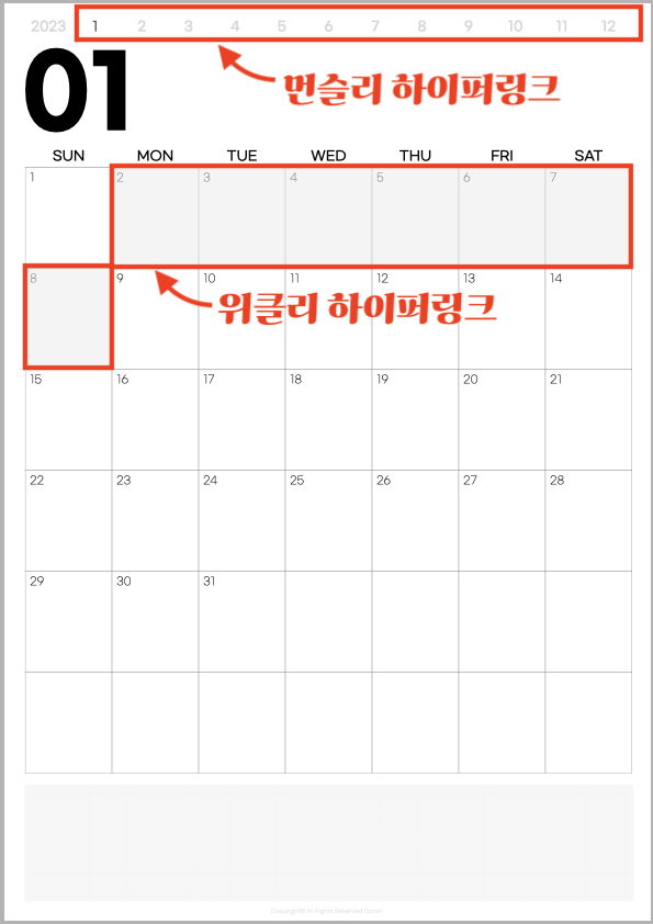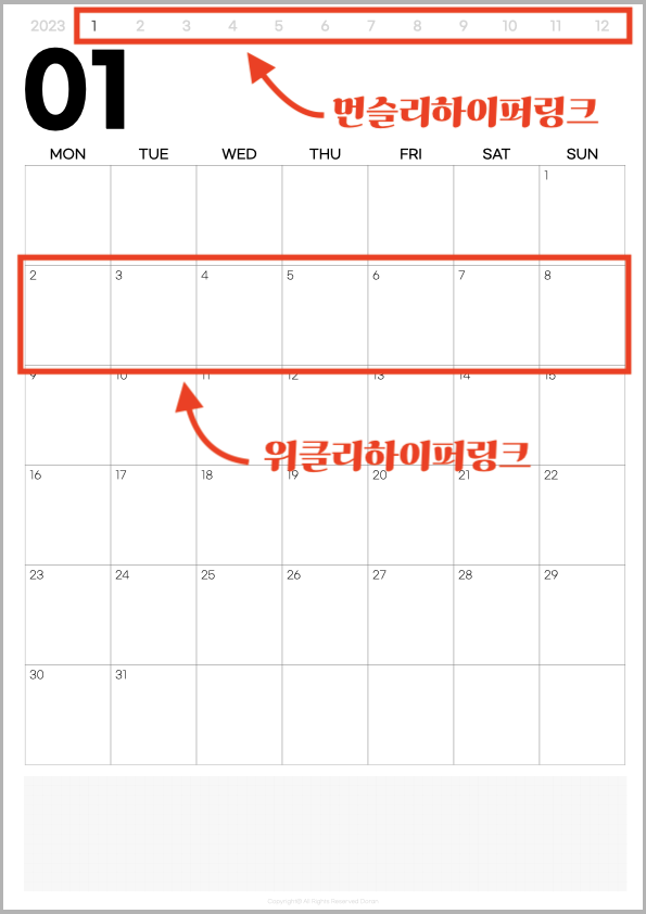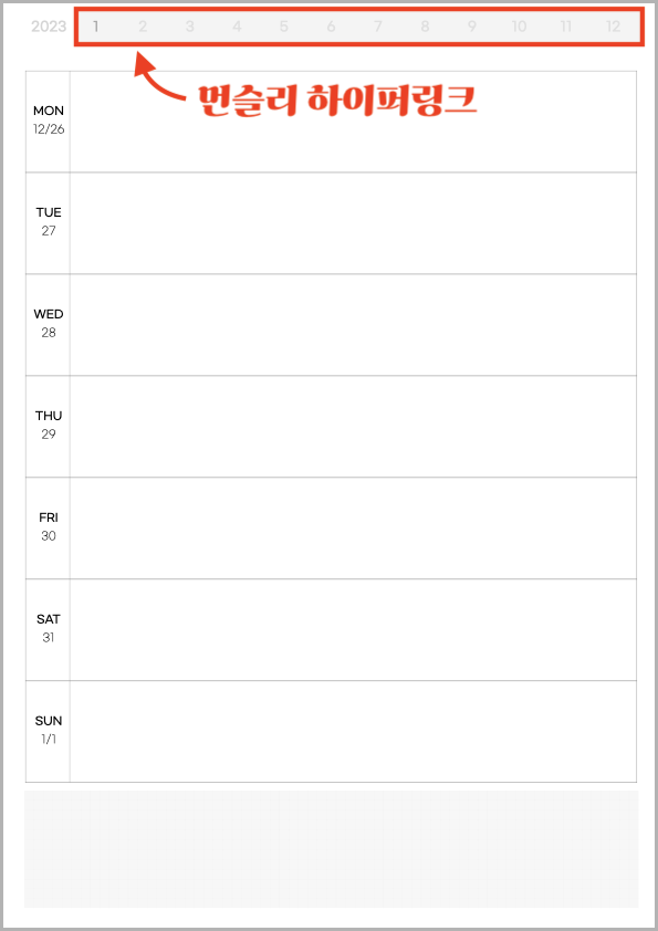 일요일 시작 속지의 경우에는 아래 그림처럼 월요일부터 토요일 + 아래칸에 있는 일요일 까지 동일한 위클리 속지입니다. 상단에 있는 숫자는 해당 먼슬리로 이동하는 하이퍼링크입니다.