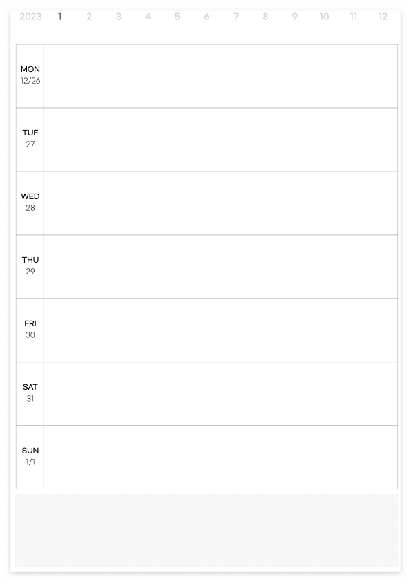 일요일 시작 속지의 경우에는 아래 그림처럼 월요일부터 토요일 + 아래칸에 있는 일요일 까지 동일한 위클리 속지입니다. 상단에 있는 숫자는 해당 먼슬리로 이동하는 하이퍼링크입니다.