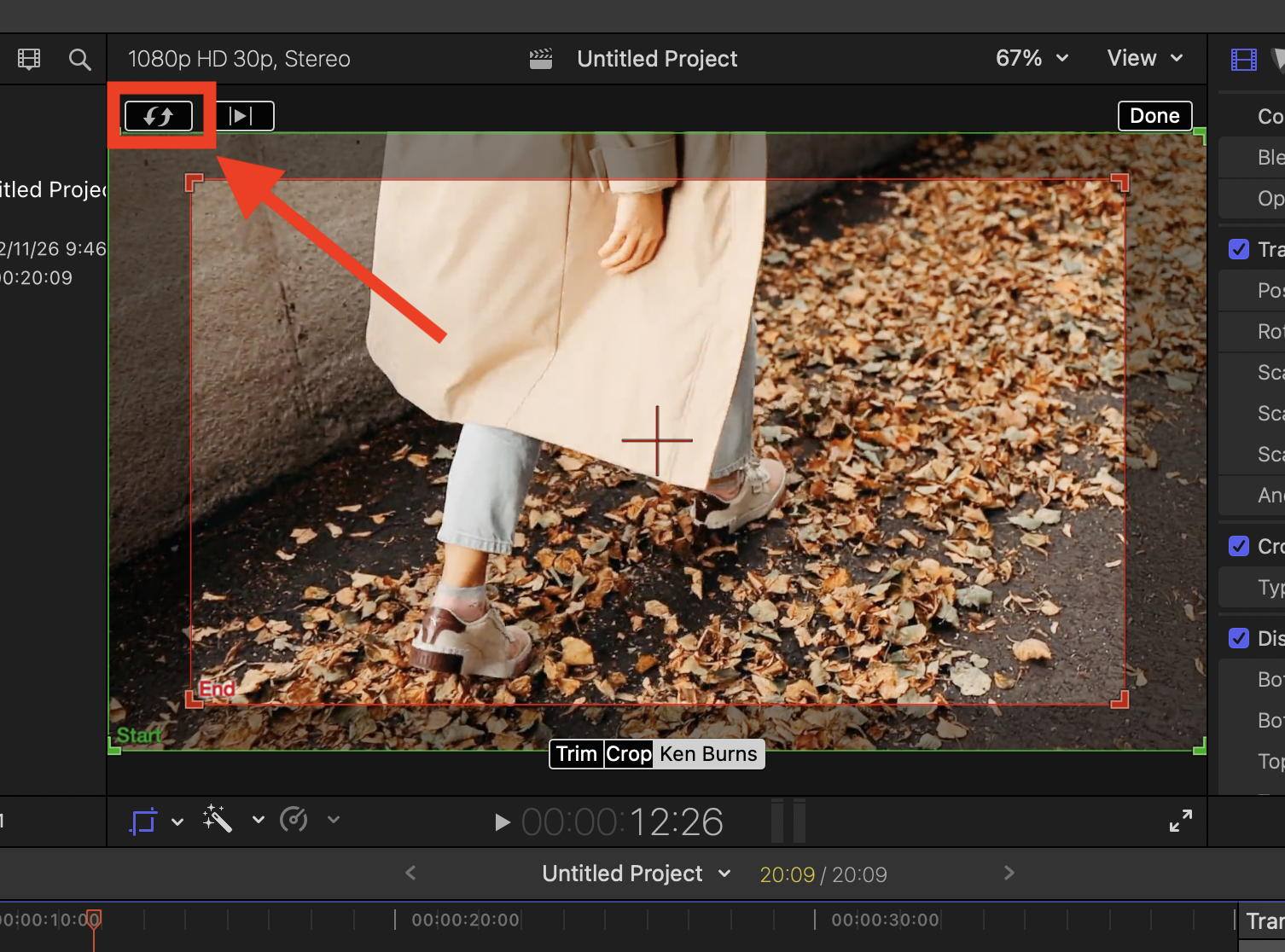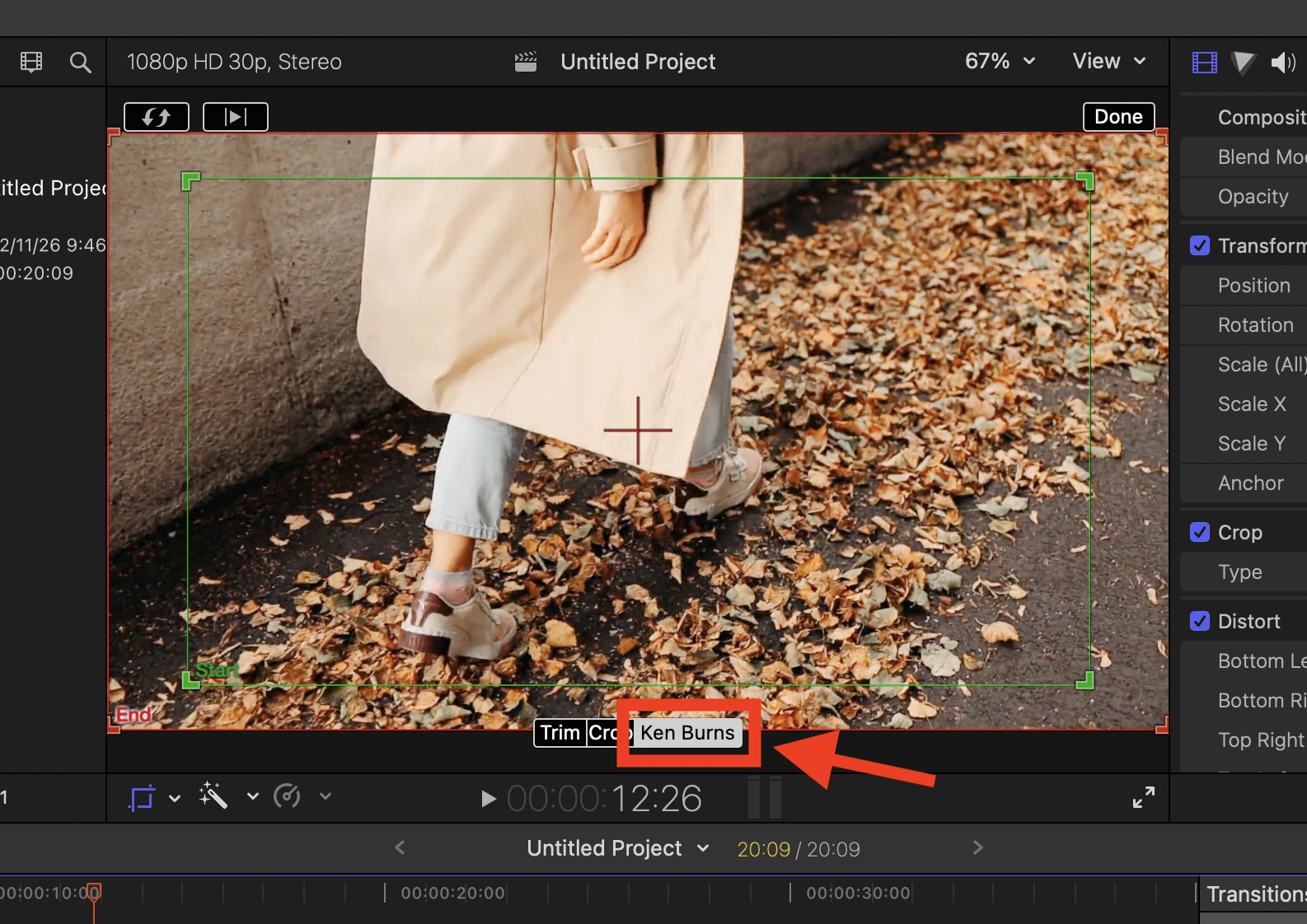 ▼ 그리고 화면 아래에 Trim, Crop, Ken Burns 라고 세개의 메뉴가 나오면, 그중에 가장 오른쪽에 있는 [Ken Burns]를 선택합니다. 그러면 화면에 빨간색의 End 박스와 초록색의 Star 박스가 나옵니다. 이게 영상의 시작화면과 끝나는 화면의 크기 입니다.