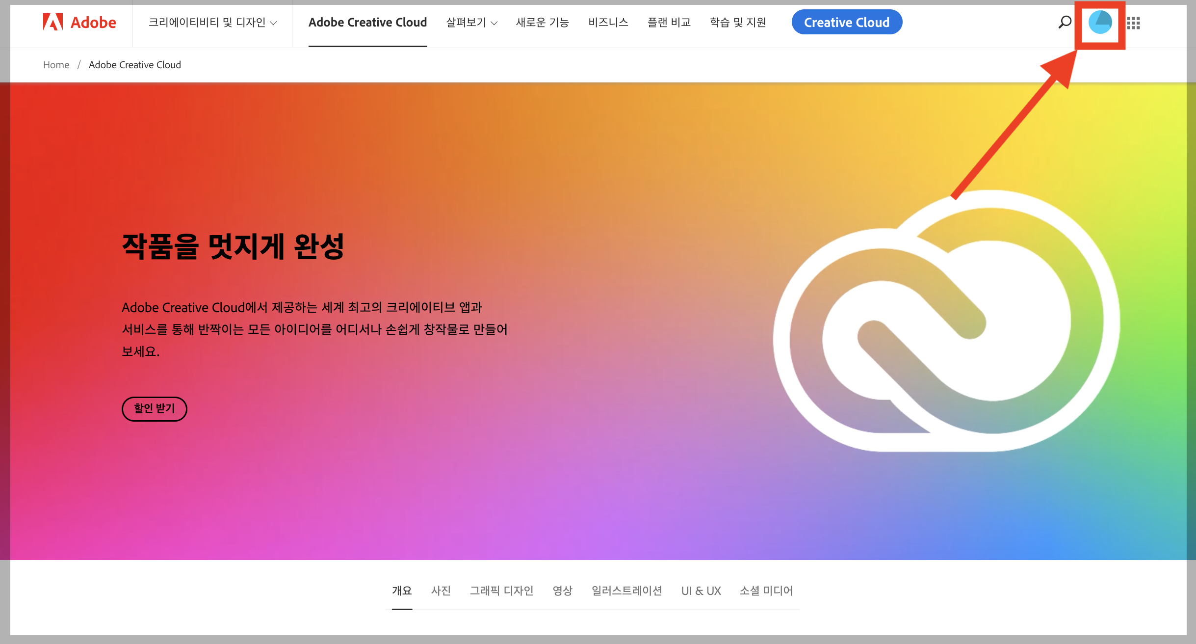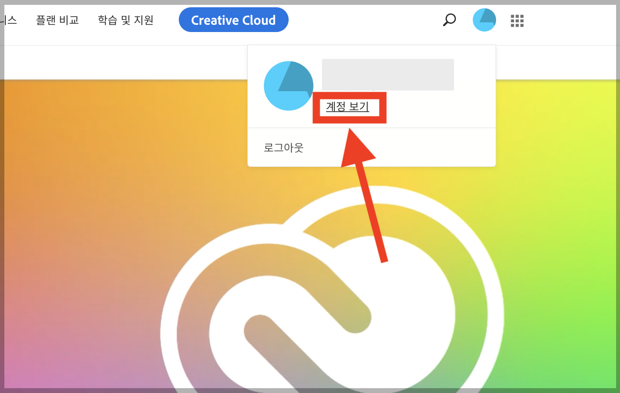 ▼ 먼저 어도비 홈페이지에 접속한다. ( https://www.adobe.com/kr ) 로그인을하고, 오른쪽 상단에 프로필을 눌러준다.