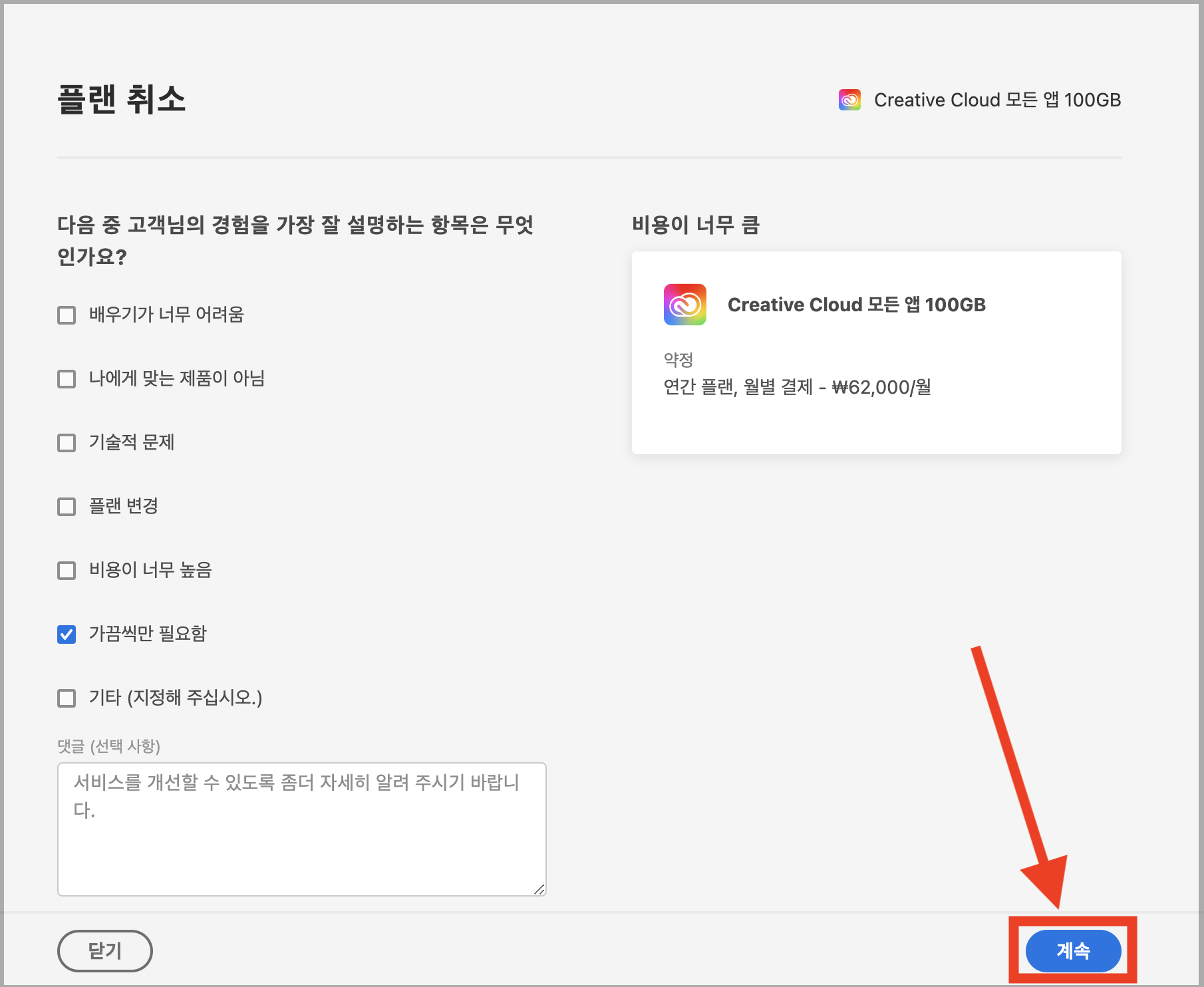 ▼ 플랜을 취소하는 이유를 선택하고, [계속] 버튼을 누른다.