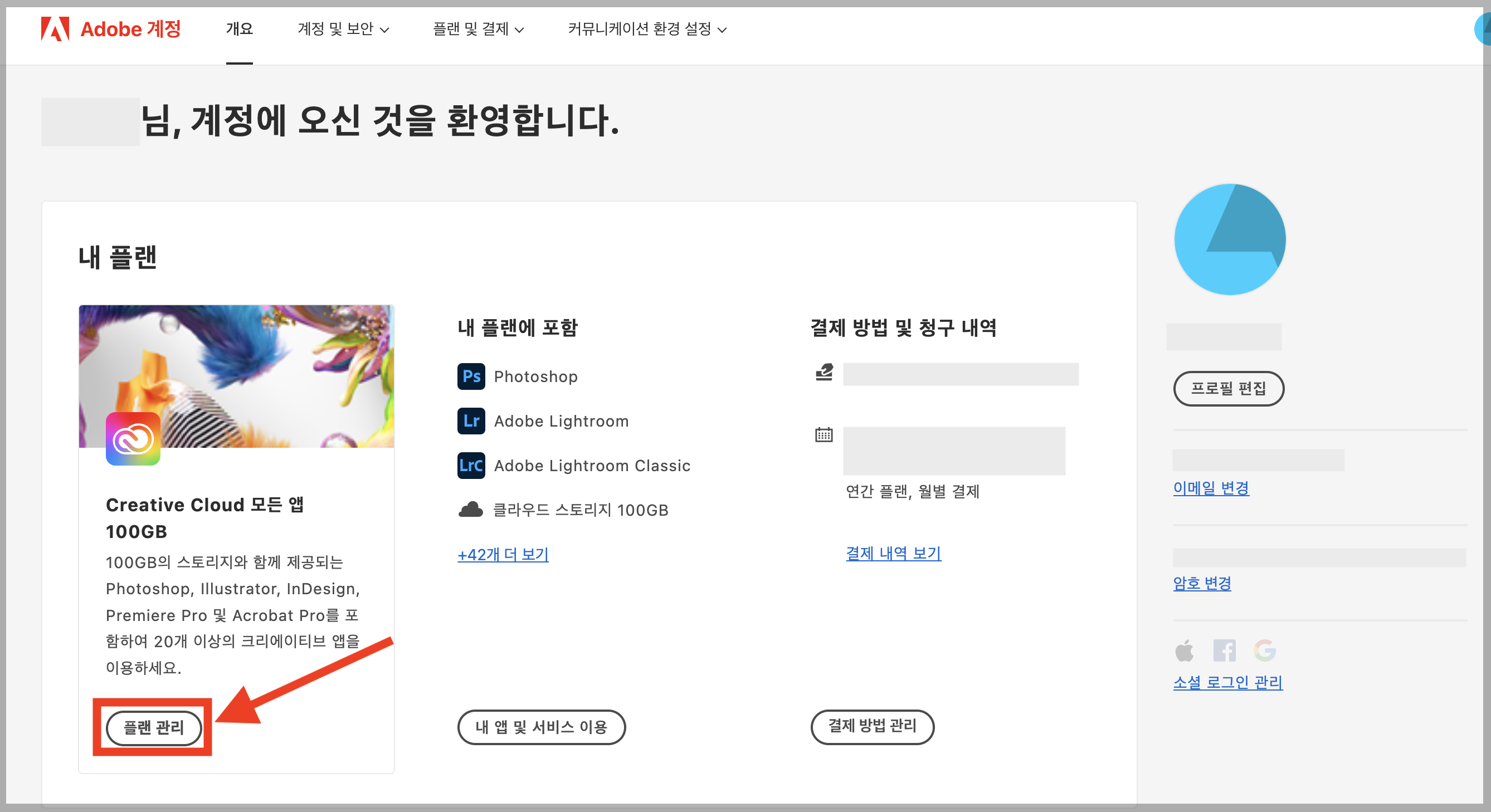 ▼ 내가 구독하고있는 플랜을 관리하는 [플랜 관리]를 눌러준다.