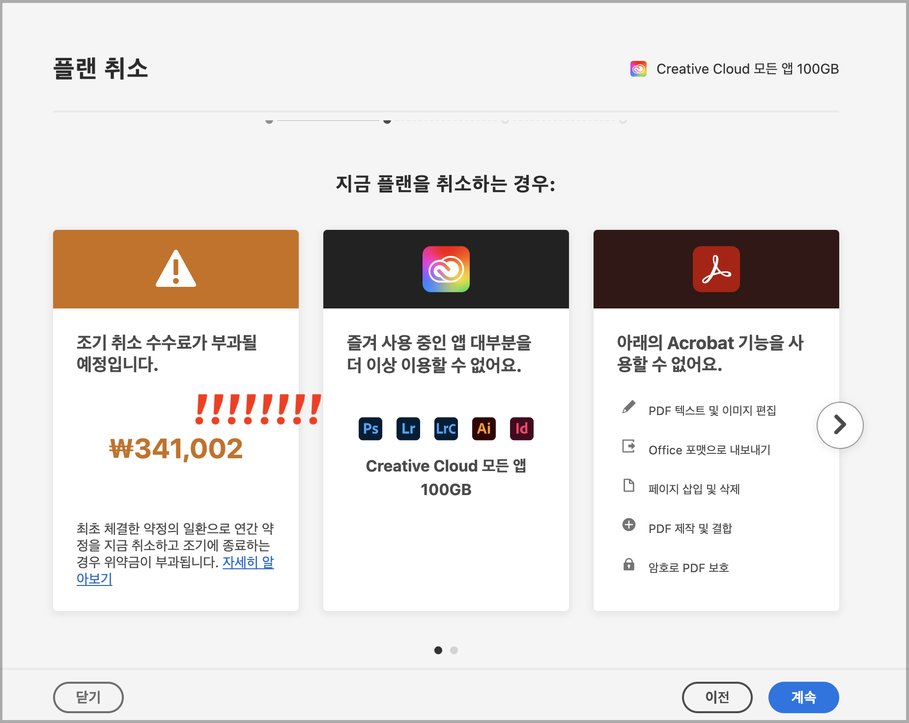 결제 취소 수수료가 너무 비싸서, 계속 사용할 가능성이 있는 프리미어 프로만 따로 개별 구독하기로했다. (이게 취소수수료보다 더 저렴하기 때문에...) 즉, [플랜 변경]으로 1년 더 사용하기로 했다.