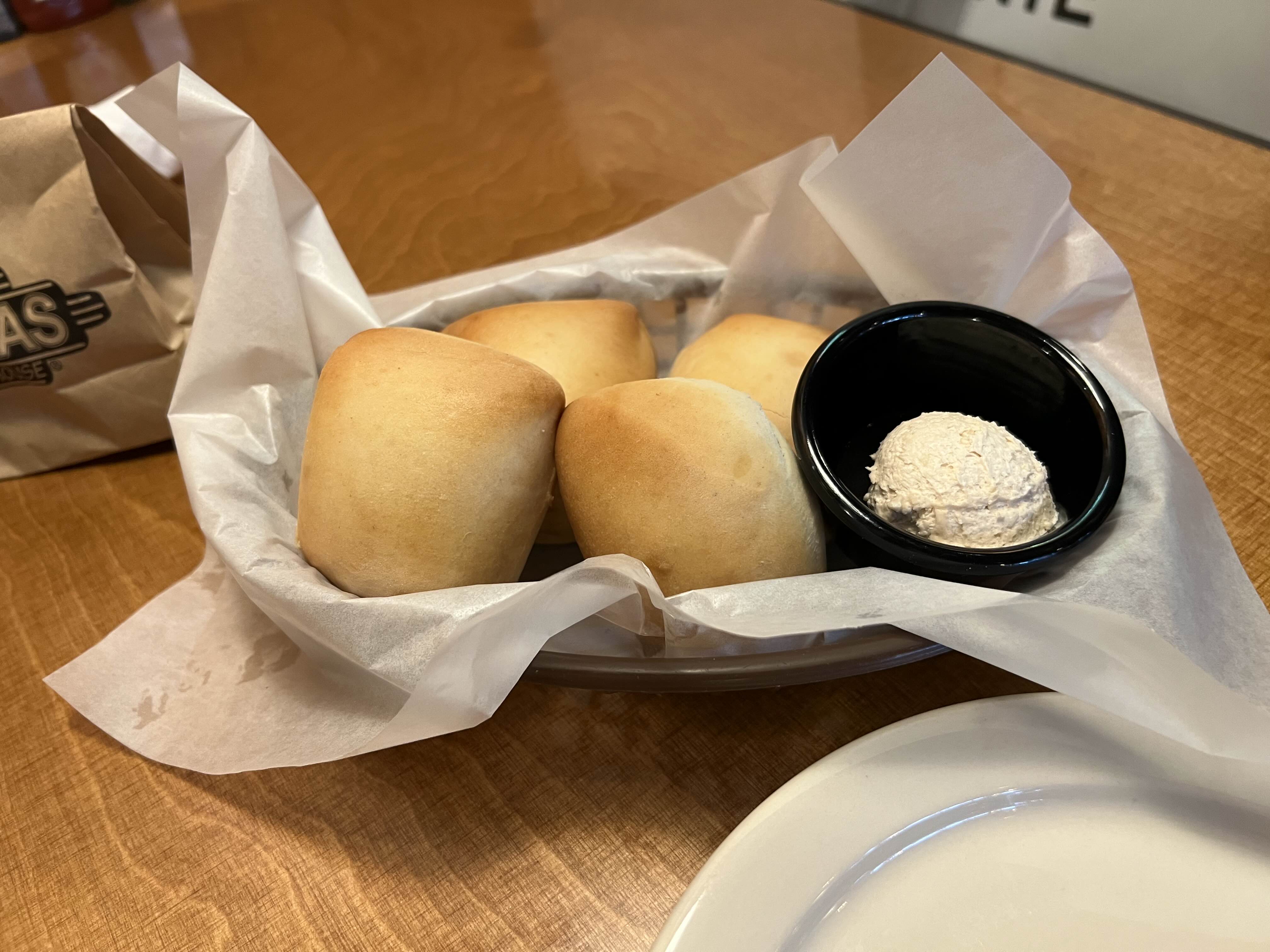 텍사스 로드 하우스에서 가장 유명하다는 식전 빵이다. 사실 생긴 모양은 모닝빵과 크게 다르지 않아서 기대하지 않았는데, 아웃백 빵보다 훨씬 신선(?)하고 갓 구운 느낌이 났다.