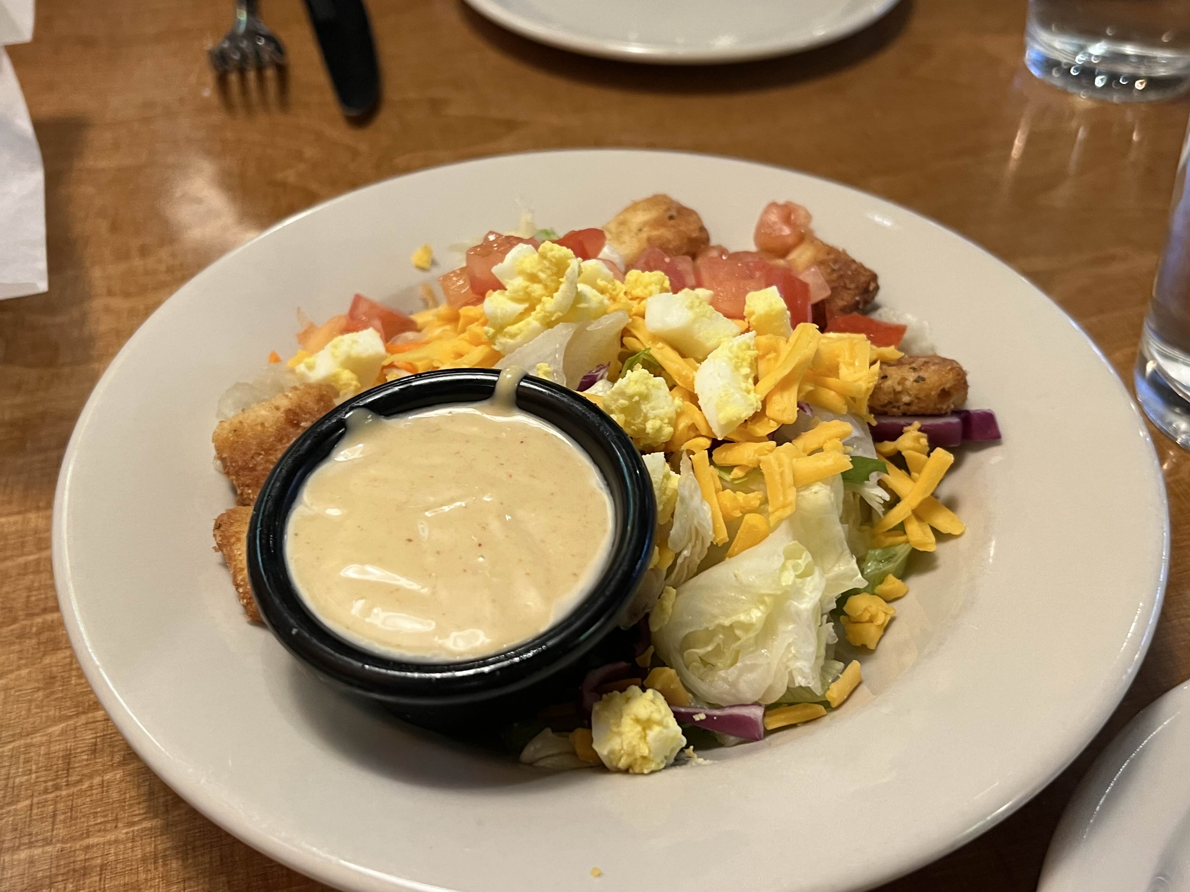 먼저 나온 하우스 샐러드. 생각보다 양이 많았고, 안에 들어있던 러스크(?) 같은 것도 맛있었다. 다음에도 또 시킬 예정.