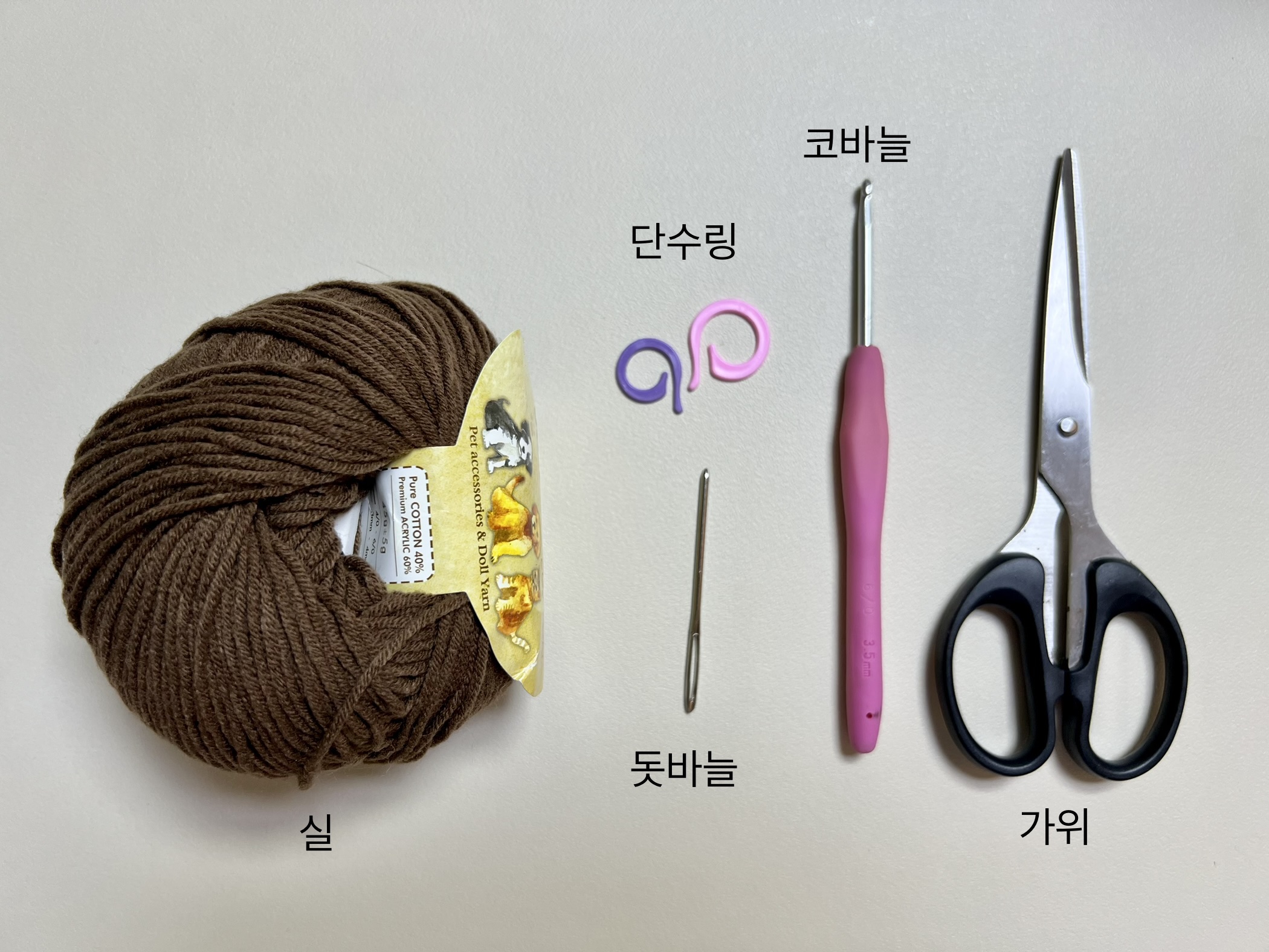 이 정도가 초보자인 내 입장에서 생각하는 입문용 최소 준비물이다. 무턱대고 코바늘이랑 실만 있으면 되는 줄 알고 시작했는데, 이 정도 준비물은 챙겨 놓아야 배우는데 무리가 없는 것 같다.
