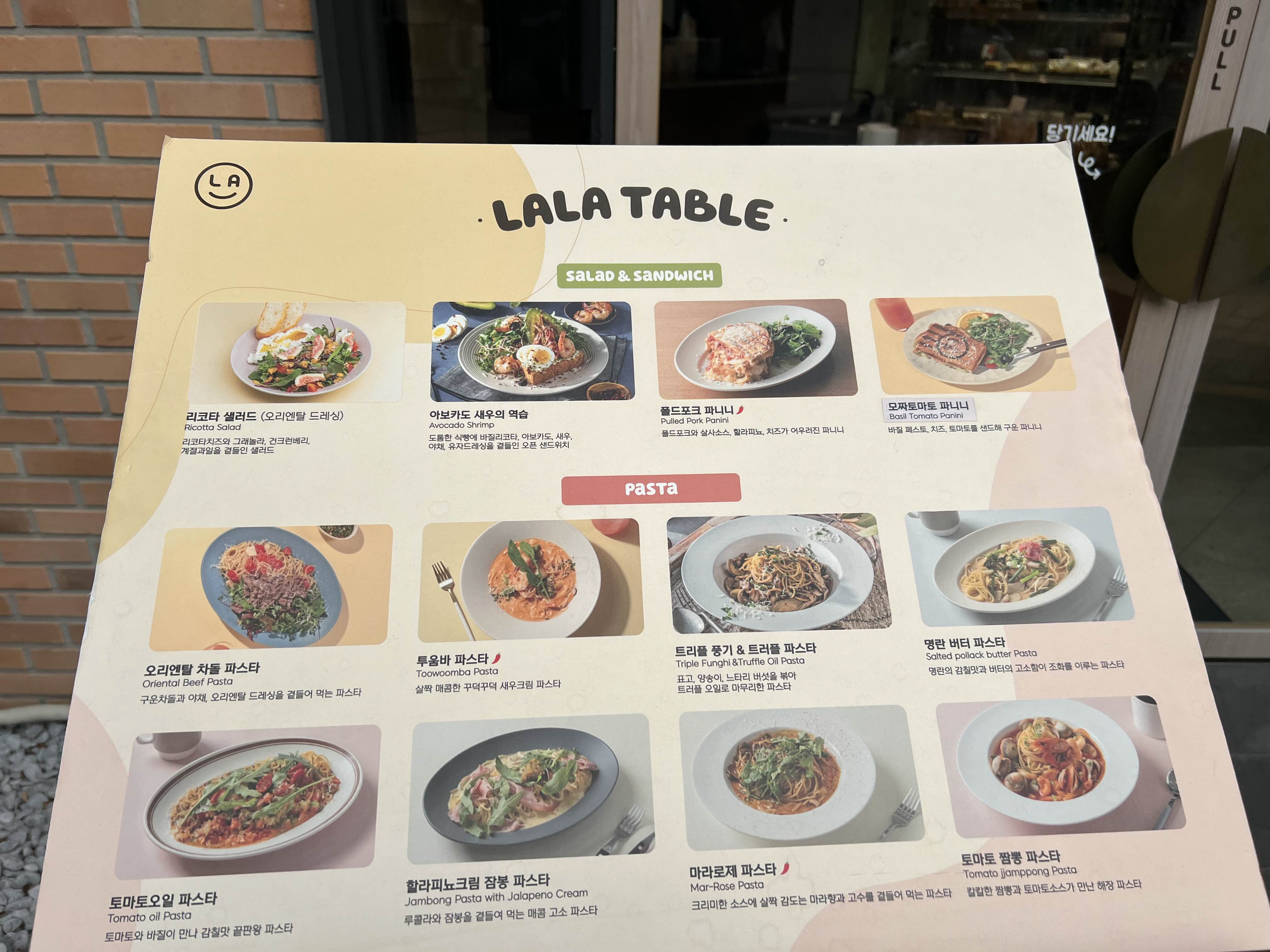 우리는 이미 점심을 먹고 온 상태이기 때문에 파스타와 샐러드는 다음에 먹어보기로 했다. 라라브레드를 방문했던 지인의 말에 의하면 명란 버터 파스타가 맛있었다고 했다. 2층에 올라가서 자리 잡았을 때 주위를 보니까 샐러드와 파스타를 많이 시켜먹는 듯했다. 다음에 꼭 이곳에서 브런치를 먹어봐야지.