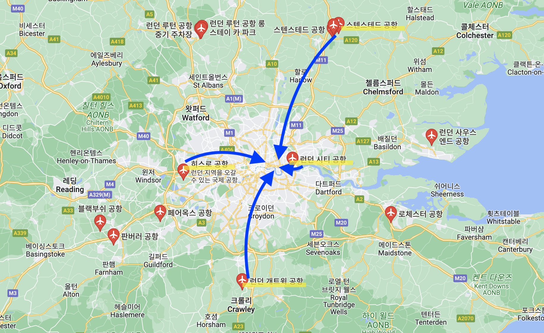 유럽에 가본 적이 없는 나는 런던에 이렇게 많은 공항이 주변에 있는지 몰랐다. 서울처럼 인천공항만 선택하면 되는 줄 알았다. 그런데 공항 선택부터 난관이라니. 물론 항공권 금액이 선택에 가장 많은 영향을 주겠지만, 각 공항마다 장단점이 있을 것이기에 대표 공항 몇 개를 조사해보고 선택하려고 한다.