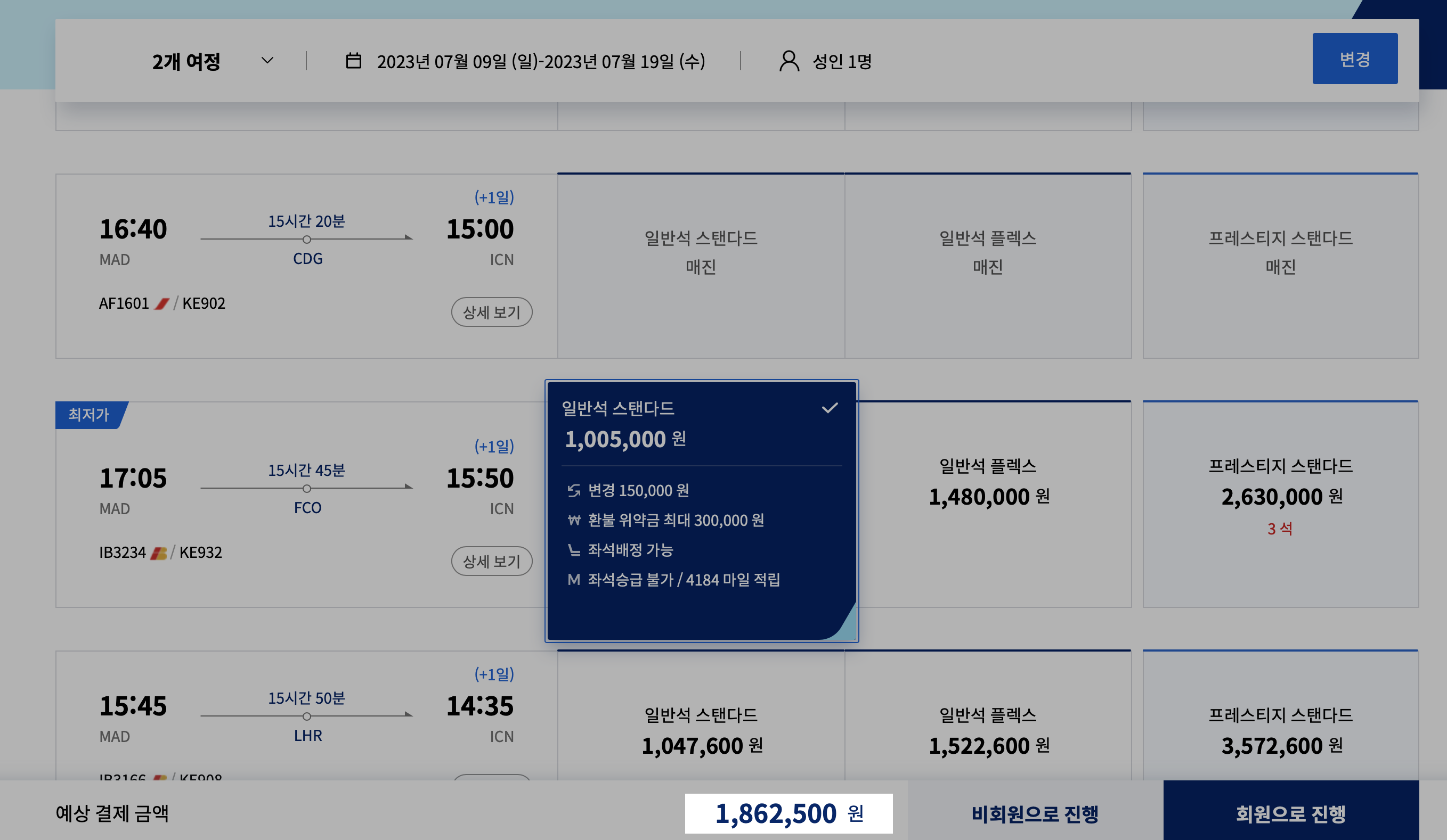 기준은 대한항공 직항(없을 경우 경유) & 다구간 & 최저가 검색. (가는 편은 고정)