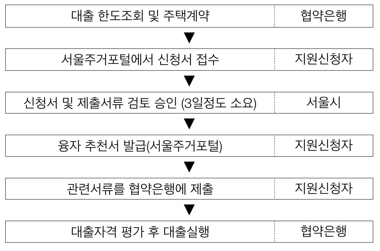 협약은행에서 대출 한도를 조회한 후 주택을 계약하고, 서울시에 사업 신청을하면 은행에서 대출을 받을 수 있고, 서울시에서 대출금에 대한 이자를 최장 10년간 지원받을 수 있습니다. 따라서 본인이 주택 대출금에대해 부담하는 금리가 줄어들게 됩니다. 그럼 이제 사업 개요를 하나하나 알아보도록 하겠습니다.