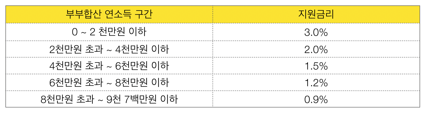 부부합산 연 소득에 따라 이자지원 금리가 달라집니다. 최고 3.0% 부터 0.9%까지 받을수 있는데요, 부부합산 연소득 9천7백만원까지 지원된다고 합니다.