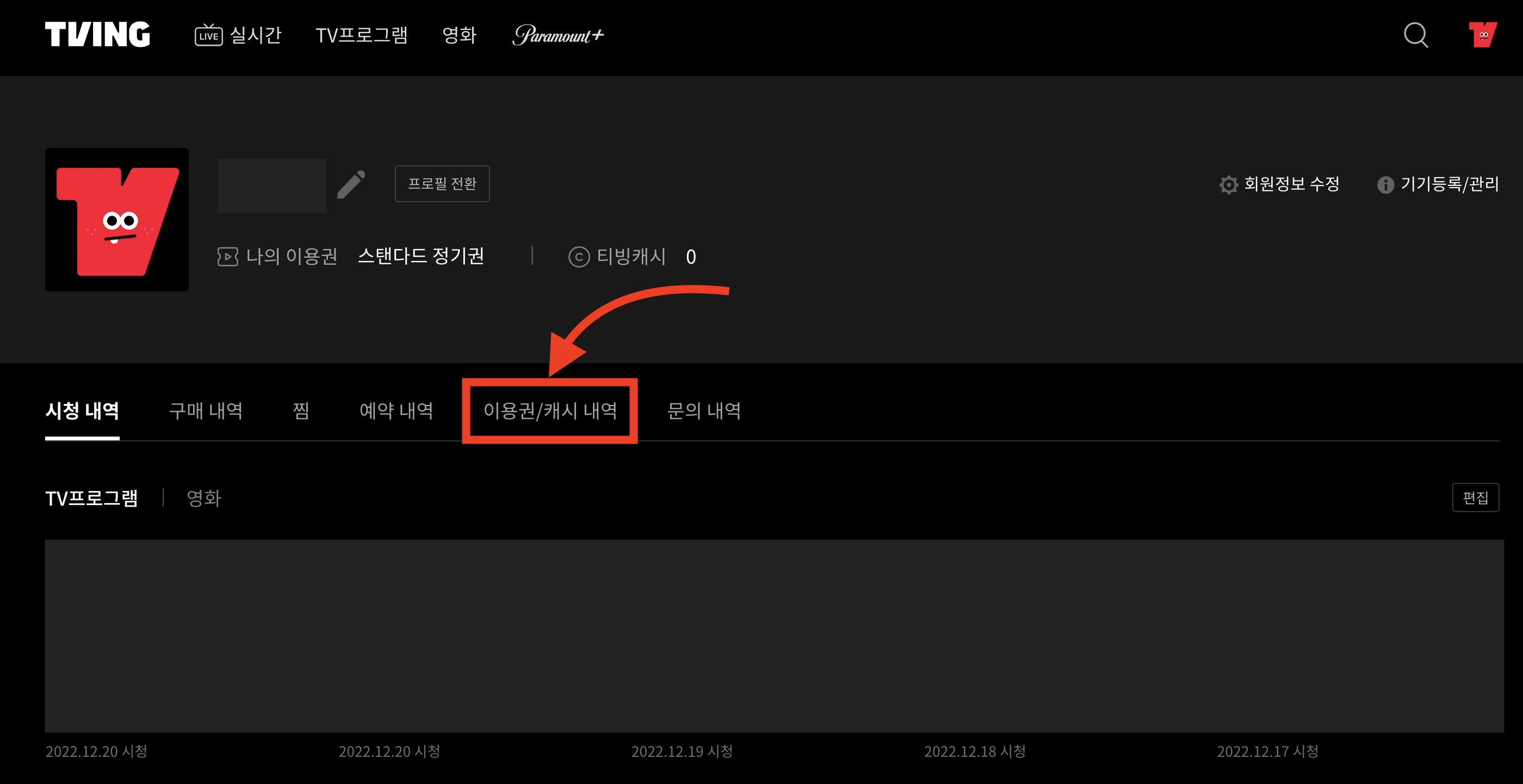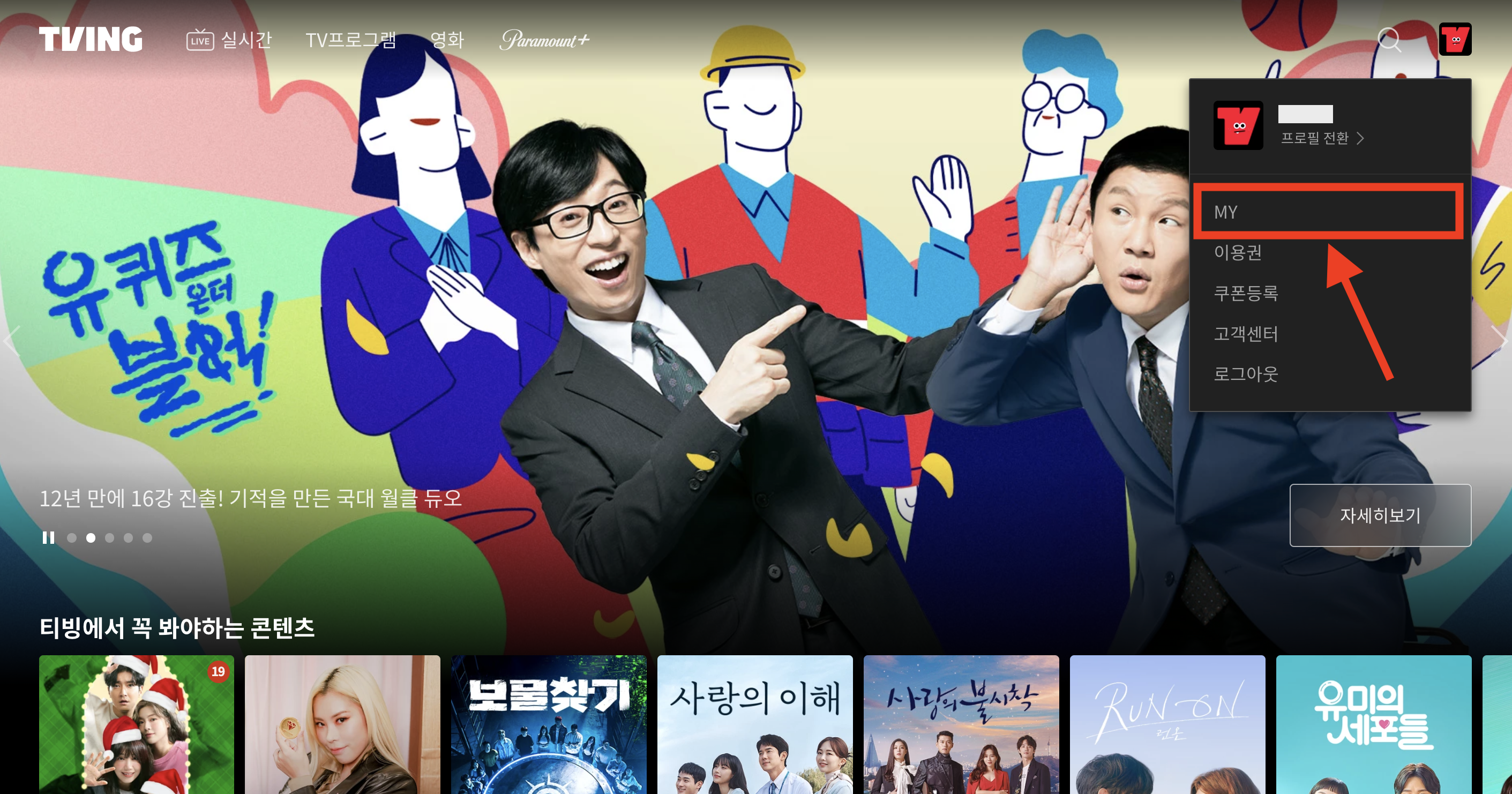 ▼ 먼저 티빙에 로그인 한뒤, 오른쪽 상단의 프로필을 누르고 [MY]에 들어간다.