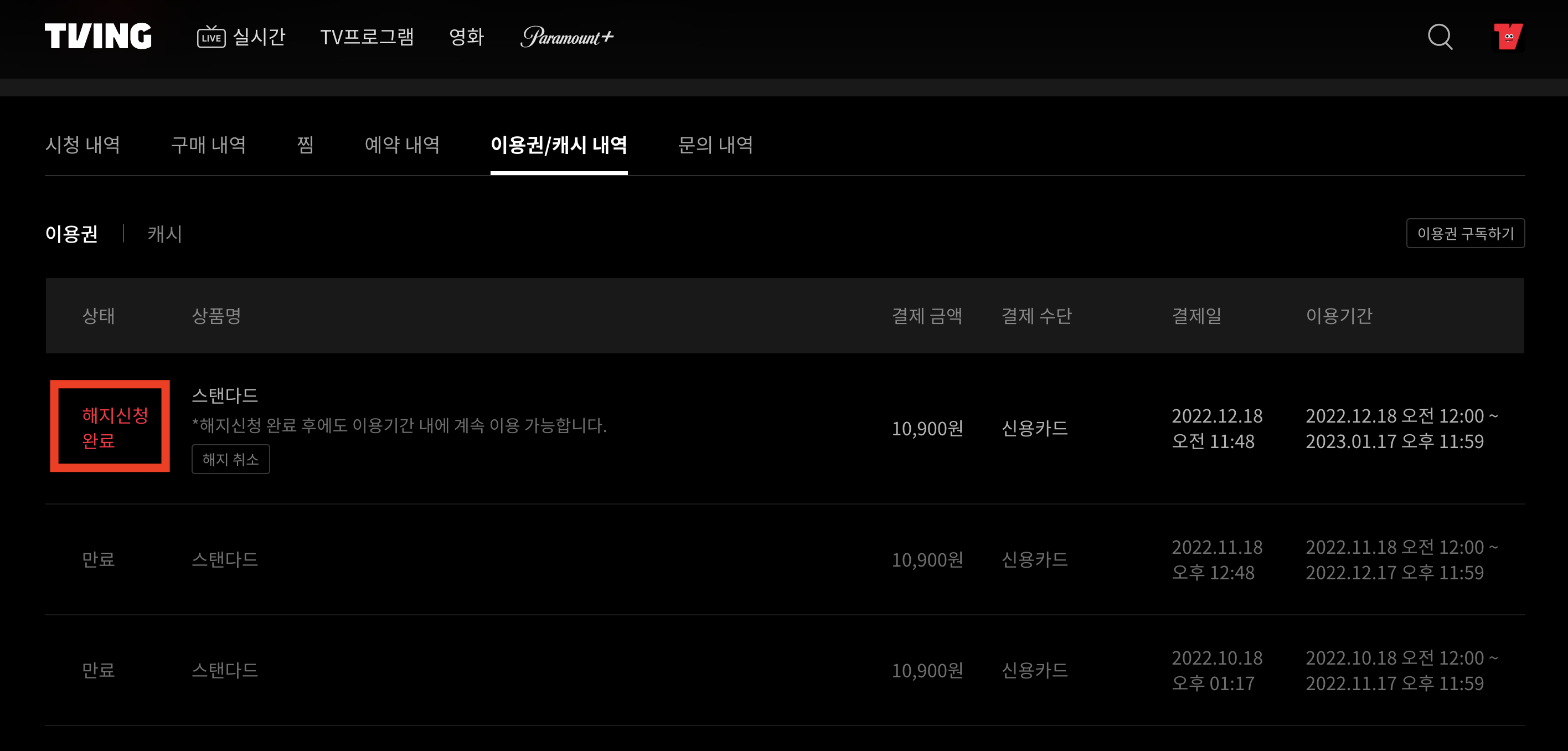 ▼ 이렇게 되면 티빙 구독권 해지가 완료 된다. 이용권 만료일 하루 전까지 해지를 취소할 수 있다고 한다.