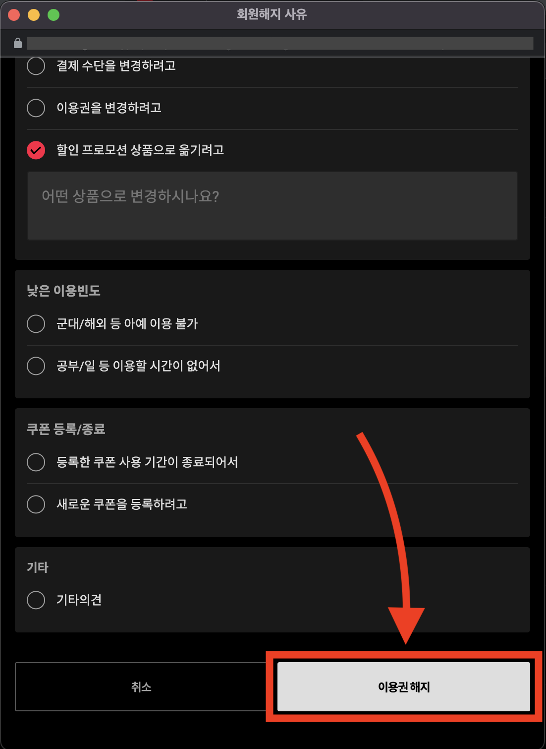 ▼ 자동결제를 해지하는 이유를 선택하고 [이용권 해지] 버튼을 누른다.