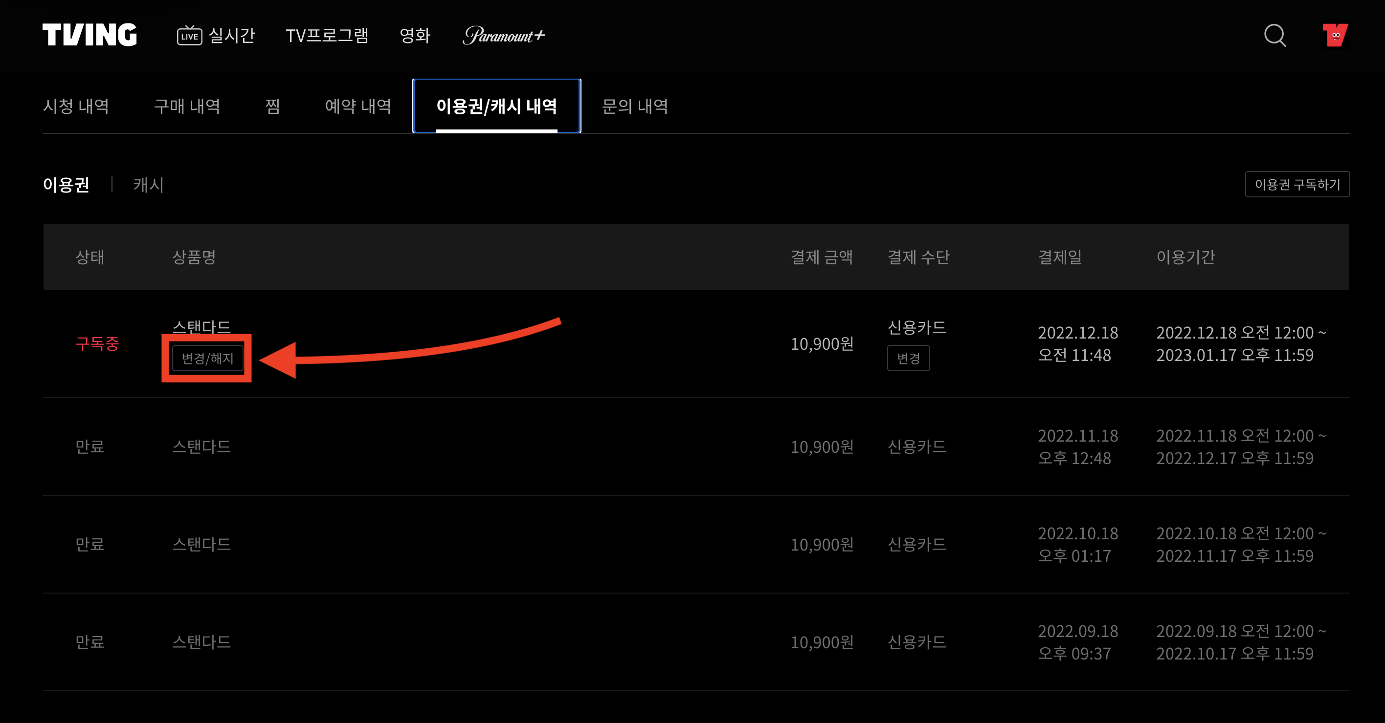 ▼ 여기에 내가 이용중인 이용권 내용이 나온다. 그중에 현재 구독 중인 이용권의 [변경/해지]를 누른다.