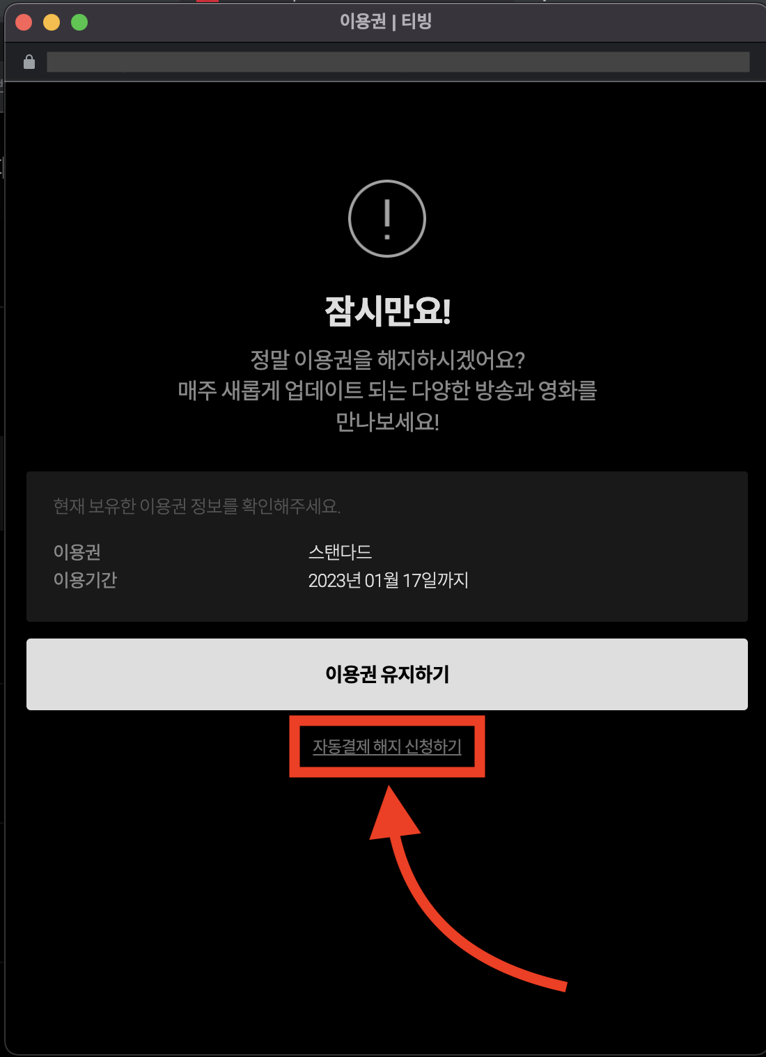 ▼ 아래와 같이 팝업창이 나오는데, 가장 맨 아래에 작게 적혀있는 [자동결제 해지 신청하기]를 누른다.