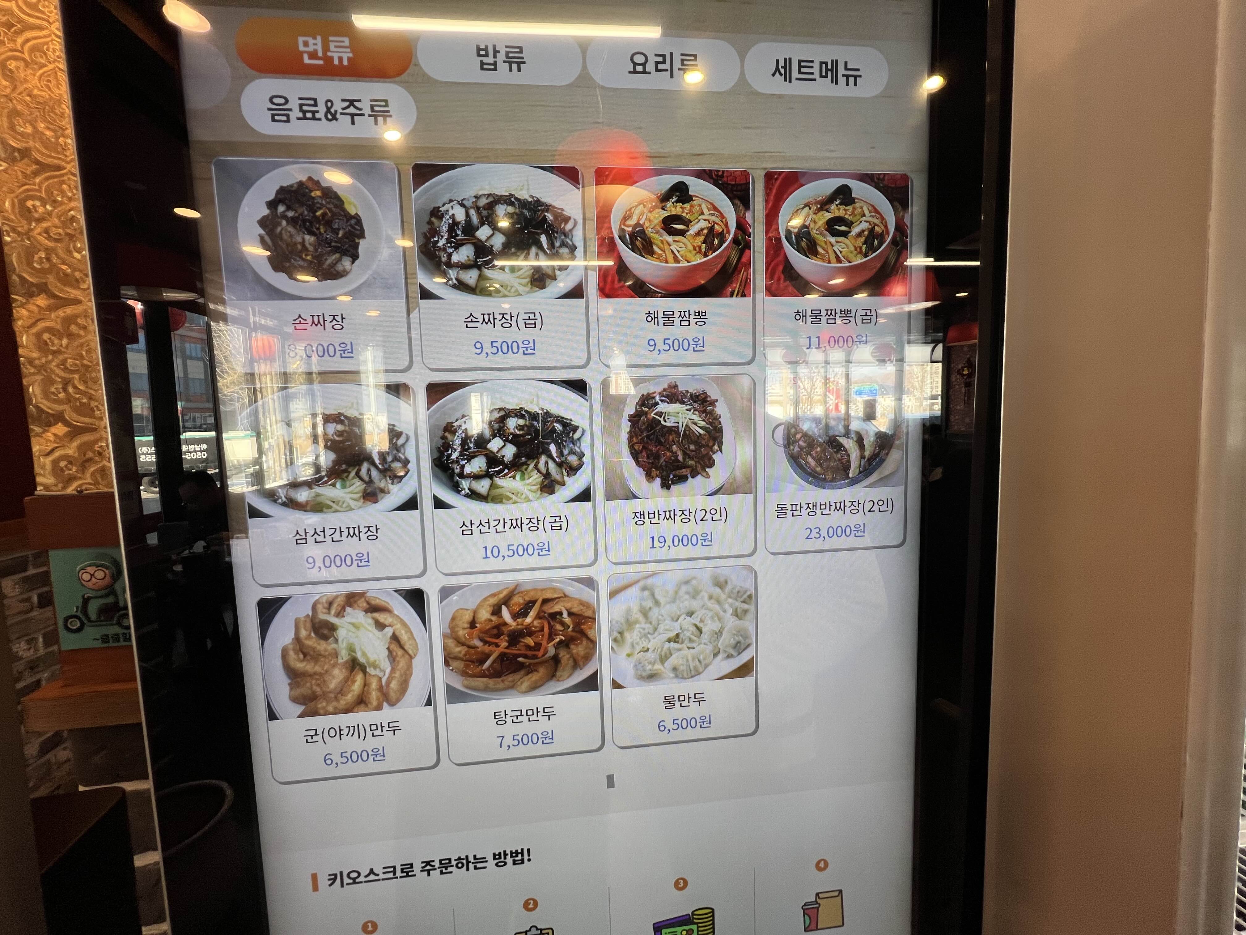 주문은 이렇게 키오스크로 할 수 있도록 되어있었다. 우리는 손짜장2개와 미니탕수육 + 짬뽕밥을 시켰다. 총금액은 42,500원이었다.