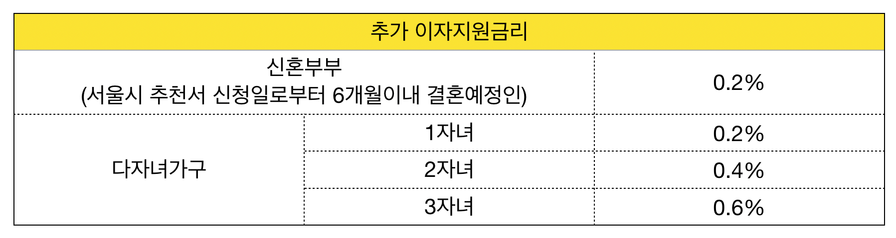 서울시 추천서 신청일로부터 6개월 이내 결혼 예정인 신혼 부부에게는 0.2%의 추가 이자지원 금리를 제공합니다. 다자녀가구의 경우 1자녀 0.2%, 2자녀 0.4%, 3자녀 0.6%의 추가 이자지원 금리를 받을 수 있습니다.