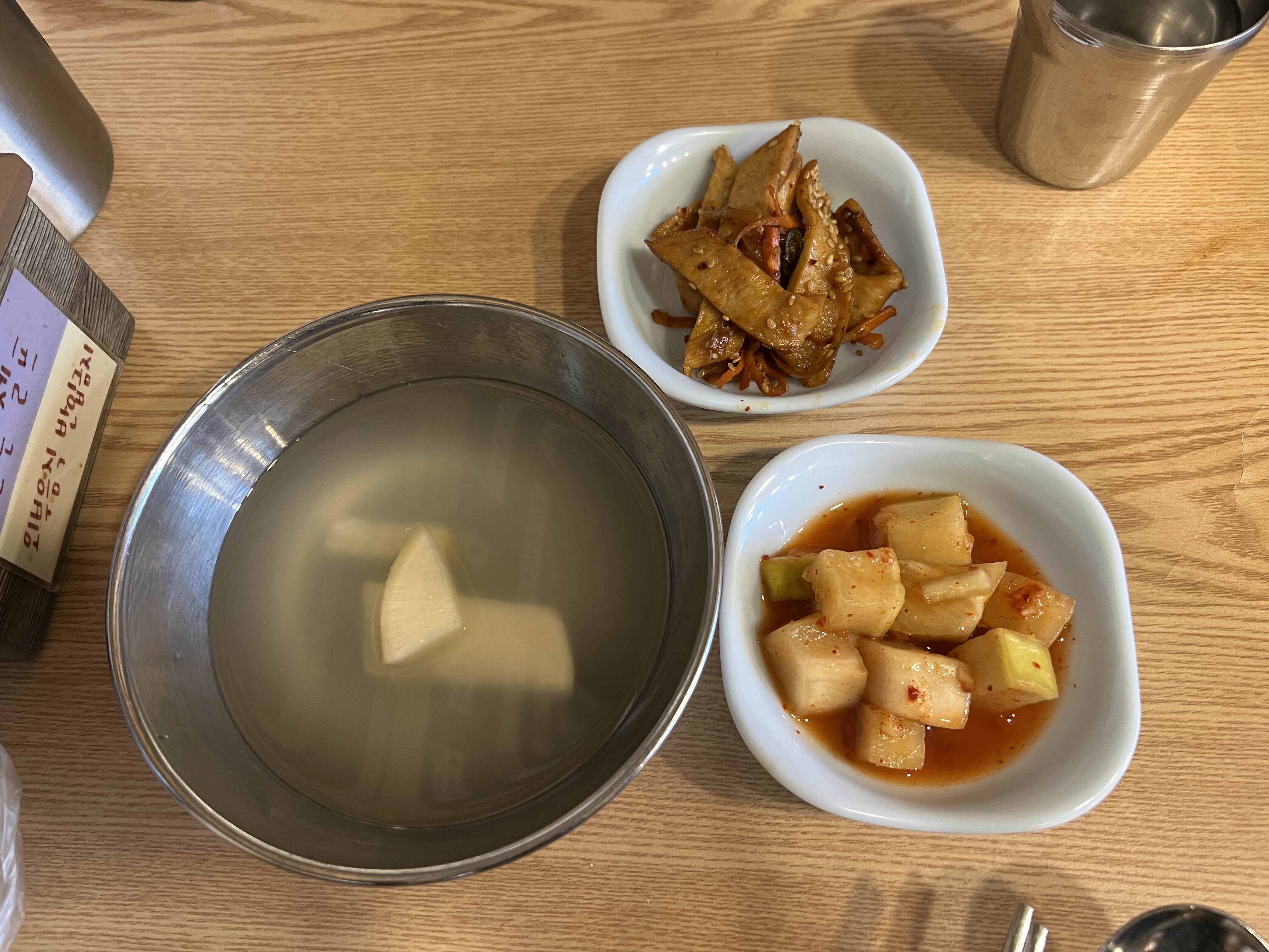 기본 밑반찬은 깍두기와 어묵볶음, 물김치가 나왔다.
