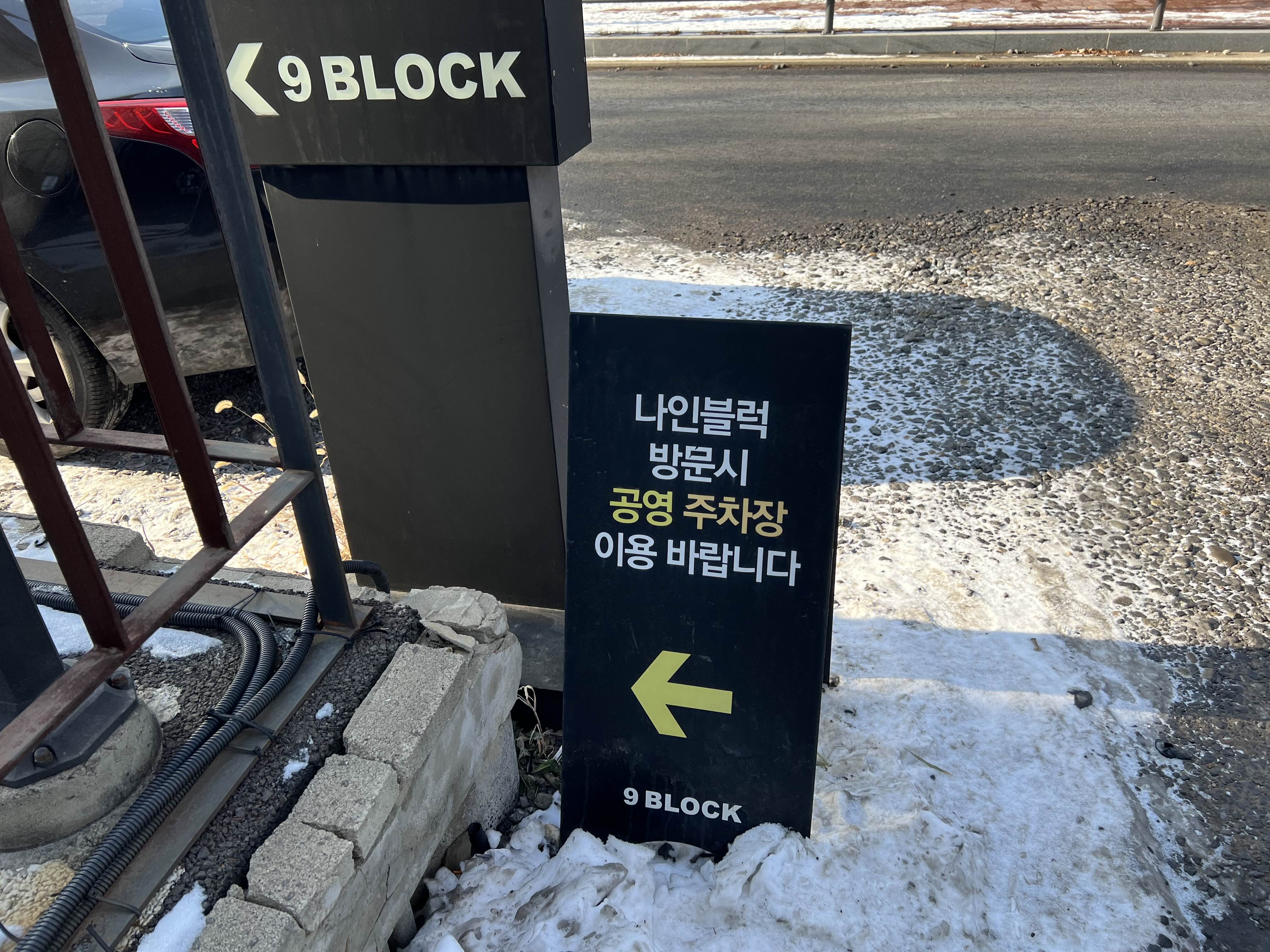 나인블럭 주변으로 차들이 주르륵 세워져 있는 바람에, 공영주차장에 세우라는 안내판이 보이지 않아서 주차장 찾느라 좀 당황했다. 나중에 주차하고 나서야 발견한 안내판.
