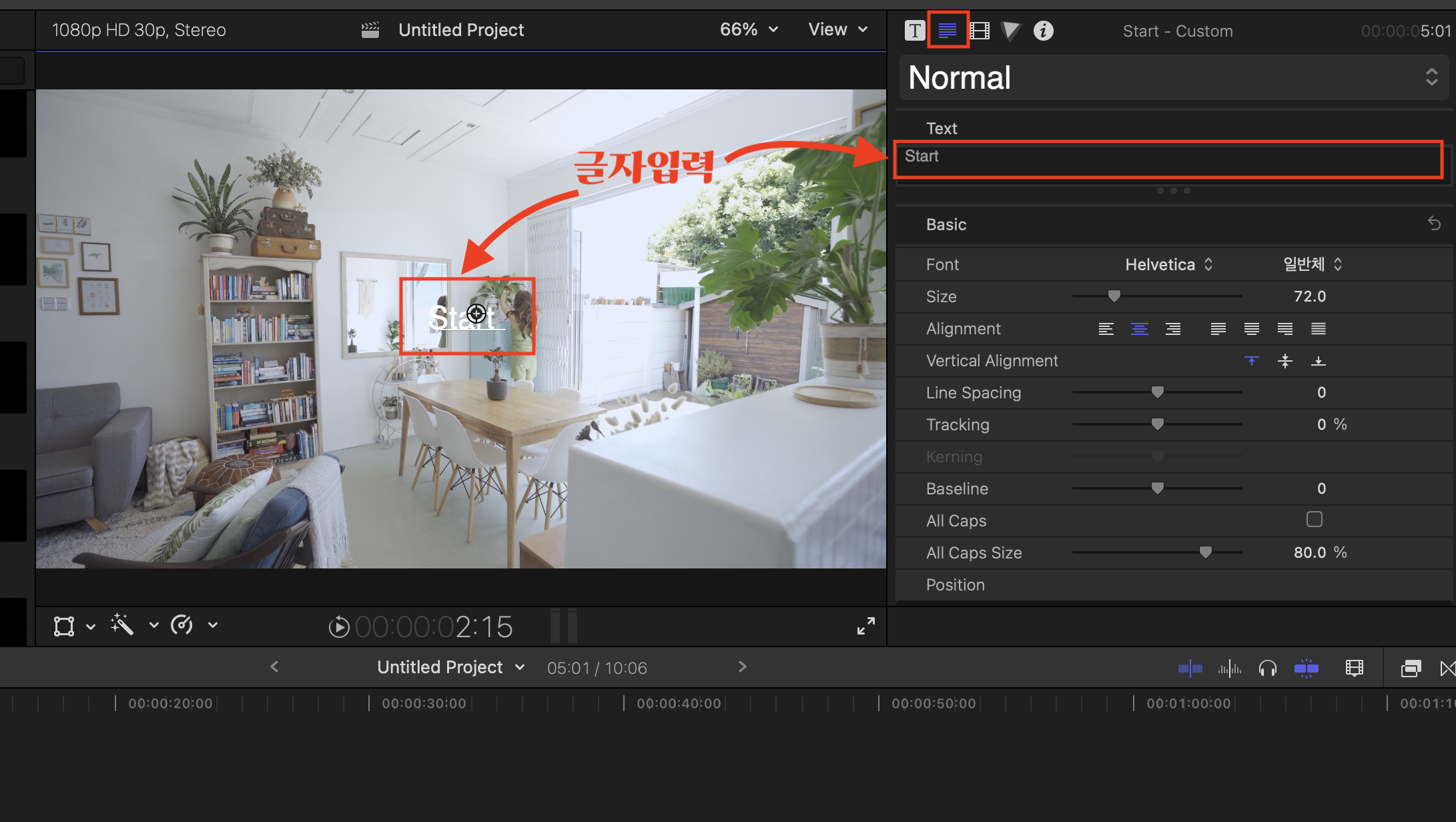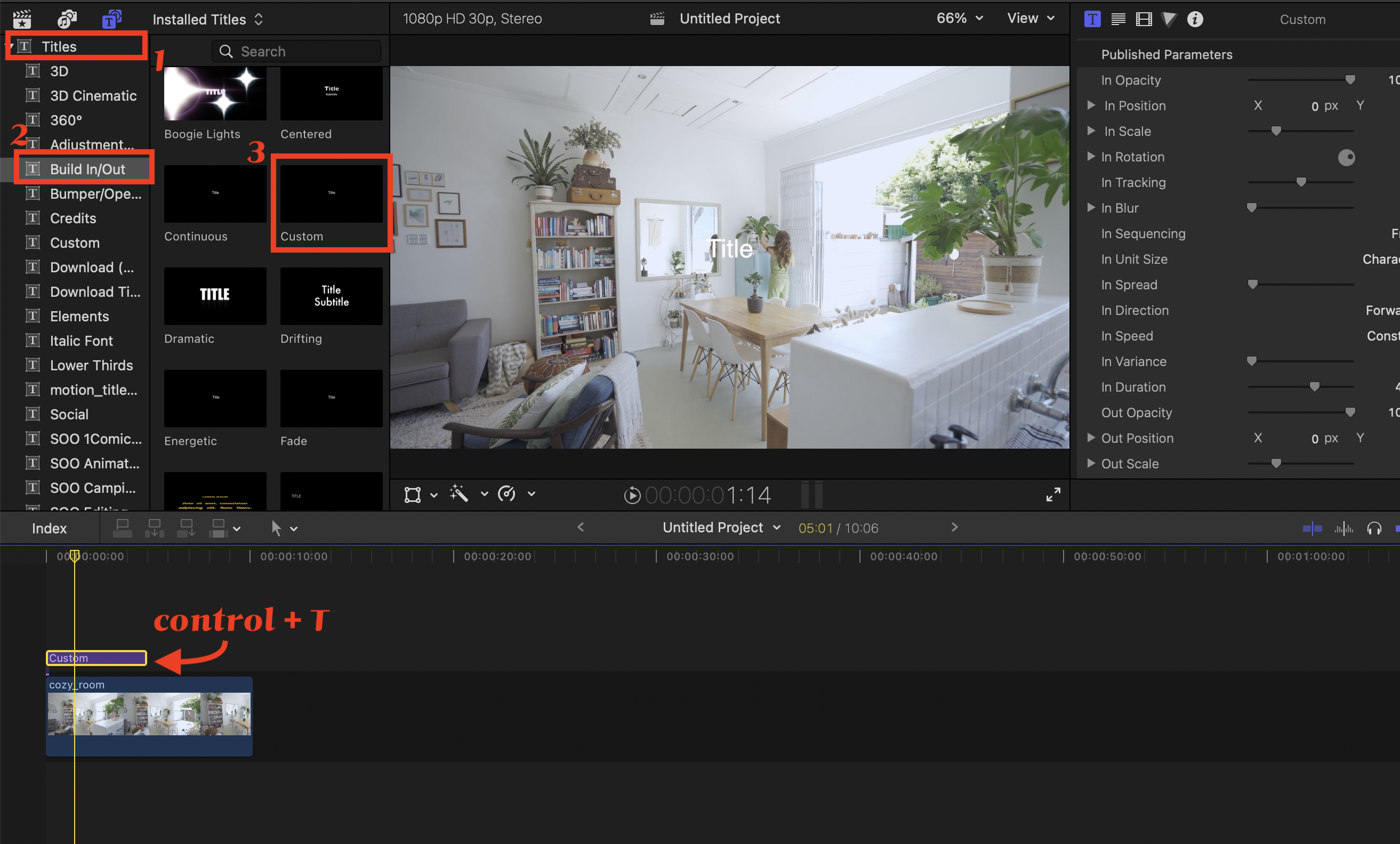 ▼ 그리고 기본 자막을 입력합니다. [Titles] - [Build In/Out] - [Custom]을 누르거나 단축키 [Control + T]를 누르면 됩니다.