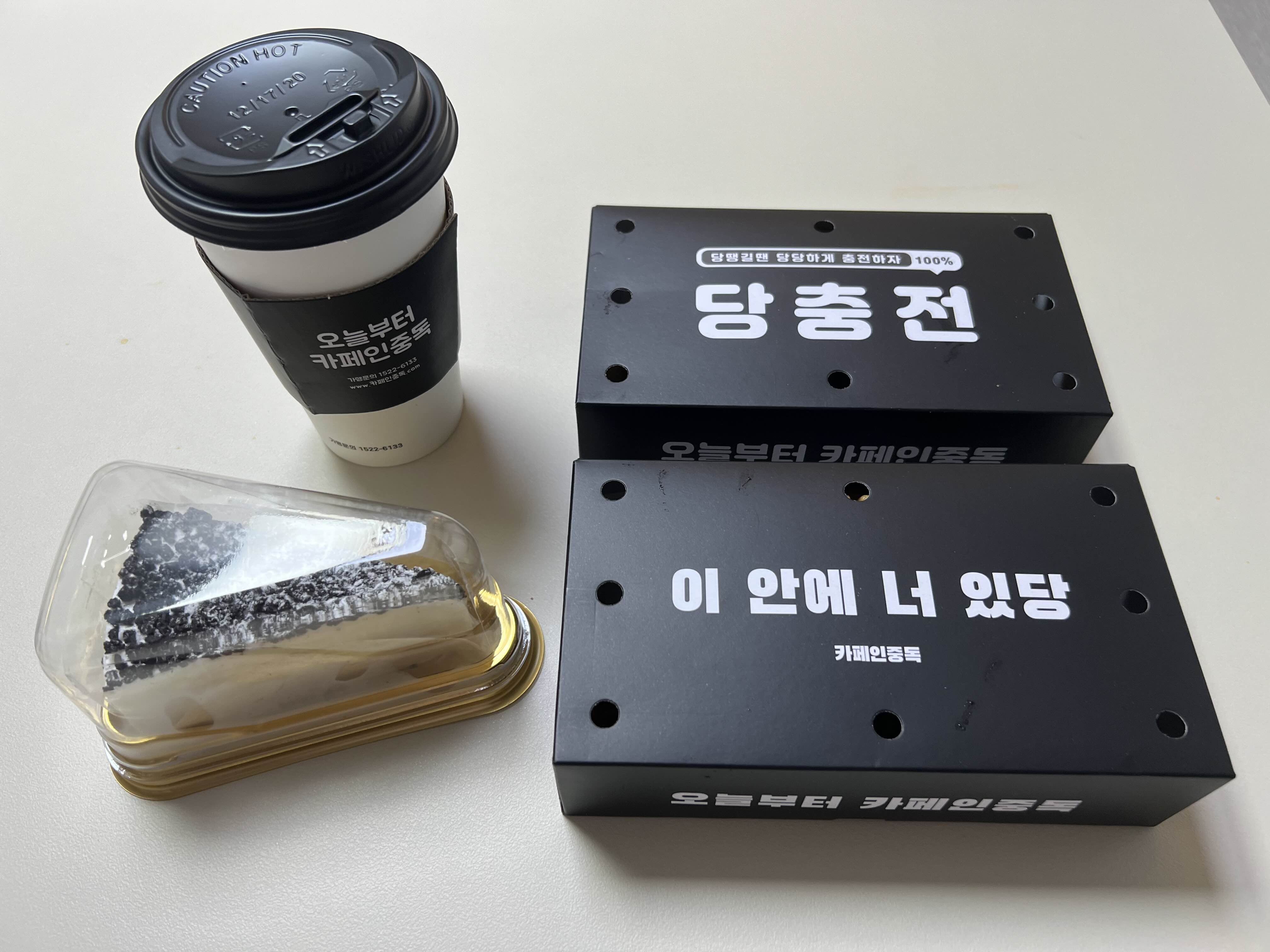 지나다니면서 간판만 보던 카페 <카페인 중독>에서 처음으로 와플과 케이크, 그리고 커피를 시켜 먹어보았다. 알고 보니 배달전문 카페라고 한다. 뭔가 달달한 게 당겨서 와플을 먹어볼까 하던 중에, 예전에 인터넷에서 '카페인중독 와플이 맛있다'라는 댓글을 본 기억이 나서 배민으로 바로 주문!