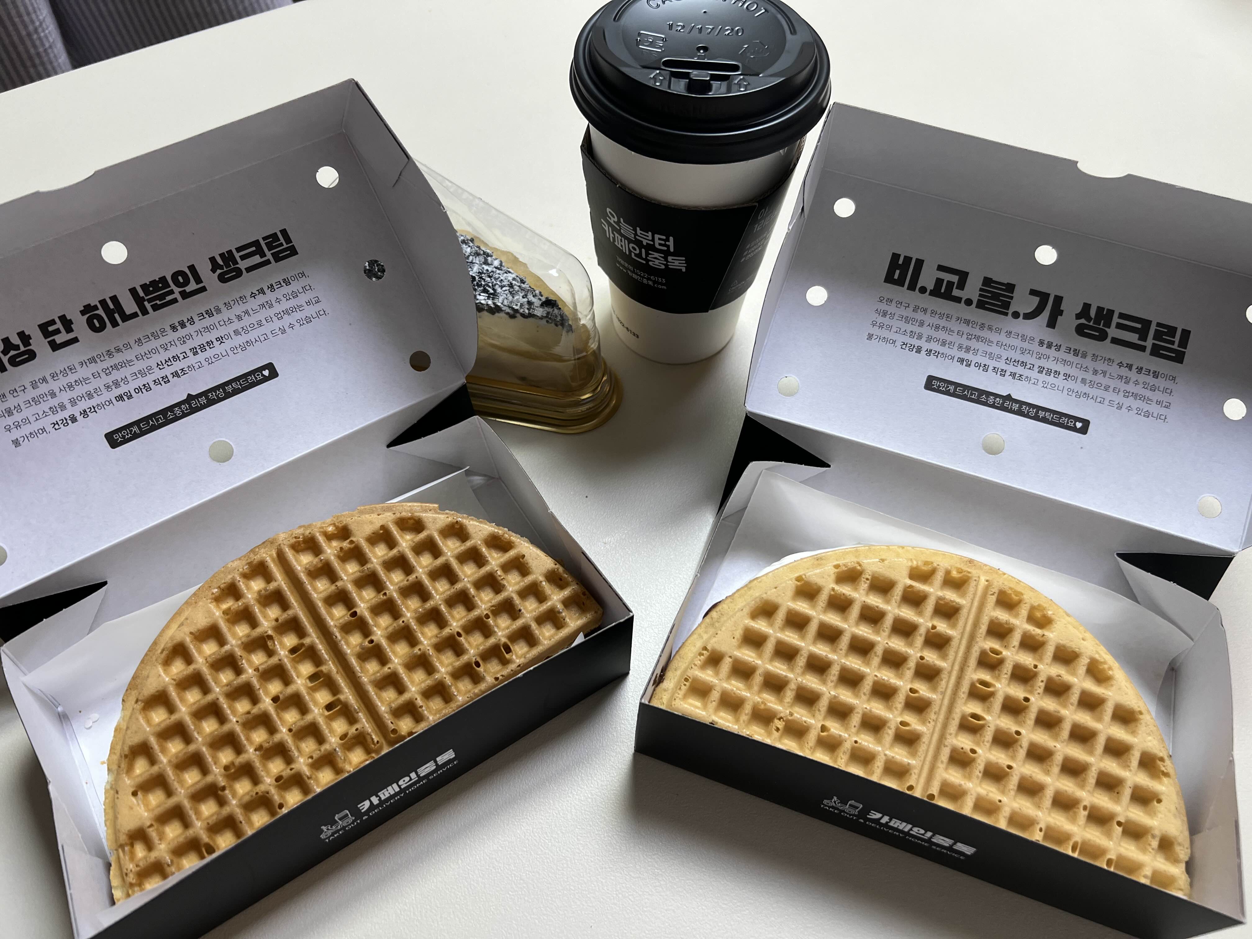 일단 포장지에 있는 문구가 정말 재미있다. 당충전, 이 안에 너 있당. 문구만 봐도 당이 충전되는 느낌이랄까. 와플이 혹시나 만족스럽지 않을까 봐 까망베르치크케이크도 하나 시켜보았다.